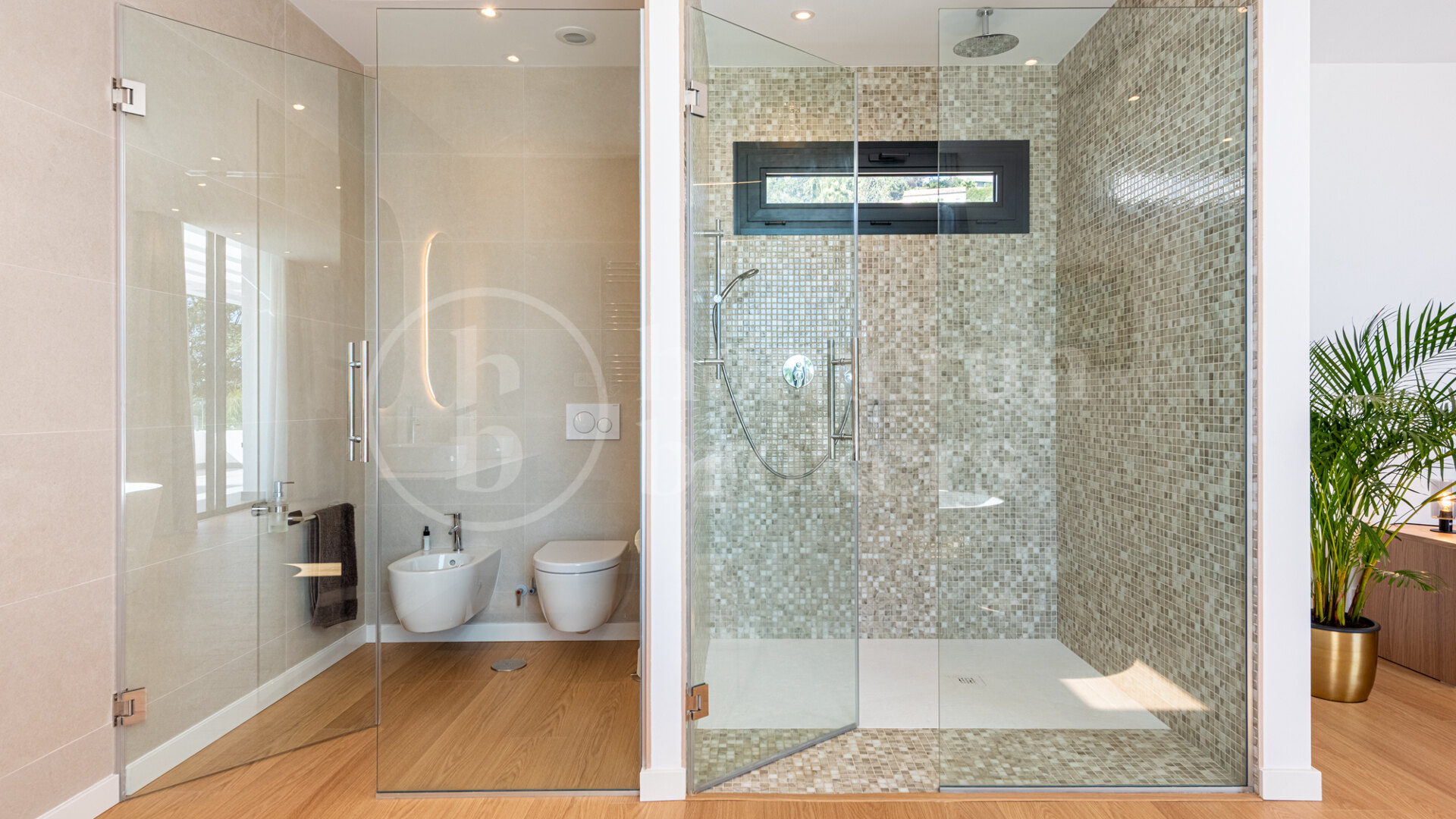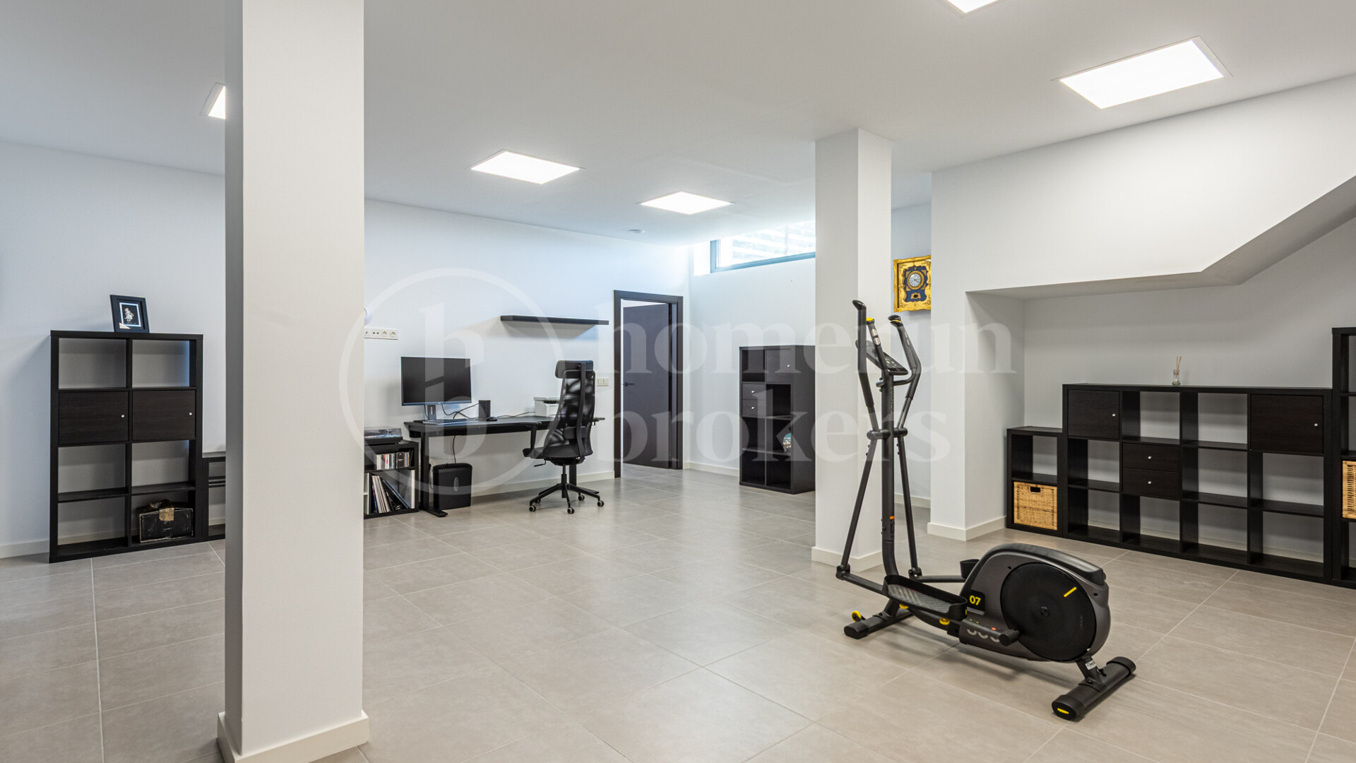 The basement level significantly expands the functionality of the villa and has been designed as a comprehensive service and wellness area. It includes a private spa, gymnasium, wine store, laundry room, pantry space and multiple technical rooms that support the operation of the home. A staff bedroom with its own bathroom provides independent accommodation, while the garage and extensive storage areas ensure the main living floors remain organised and uncluttered.