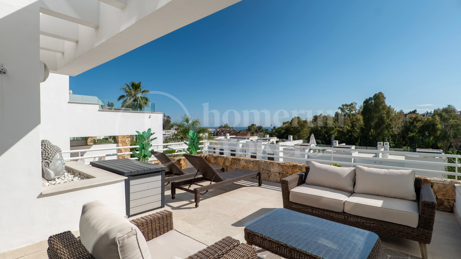 This three-bedroom townhouse for sale near Puente Romano is a spacious three-level residence offering three bathrooms, approximately 344 square metres of total living space and an impressive 115 square metres of terraces, designed to combine generous interiors with panoramic mountain and sea views. Located within a peaceful and well-maintained residential urbanisation just minutes from Puente Romano, the property delivers privacy, outdoor living and strong lifestyle appeal in one of the coast’s most desirable residential settings.