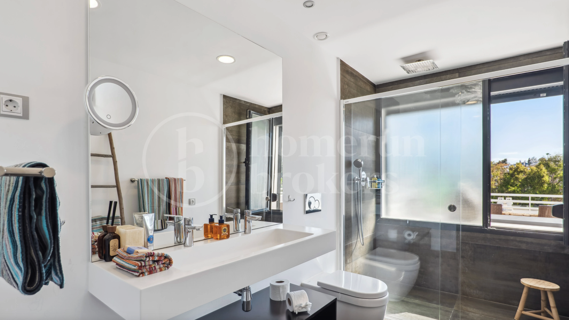 Upstairs, three generously proportioned bedrooms provide comfortable accommodation for family and guests. The master suite stands out with its own private terrace and elevated views across La Concha mountain and the Mediterranean Sea. Each bedroom is designed to maximise light and privacy, while the layout supports practical family living or use as a high-end holiday home.