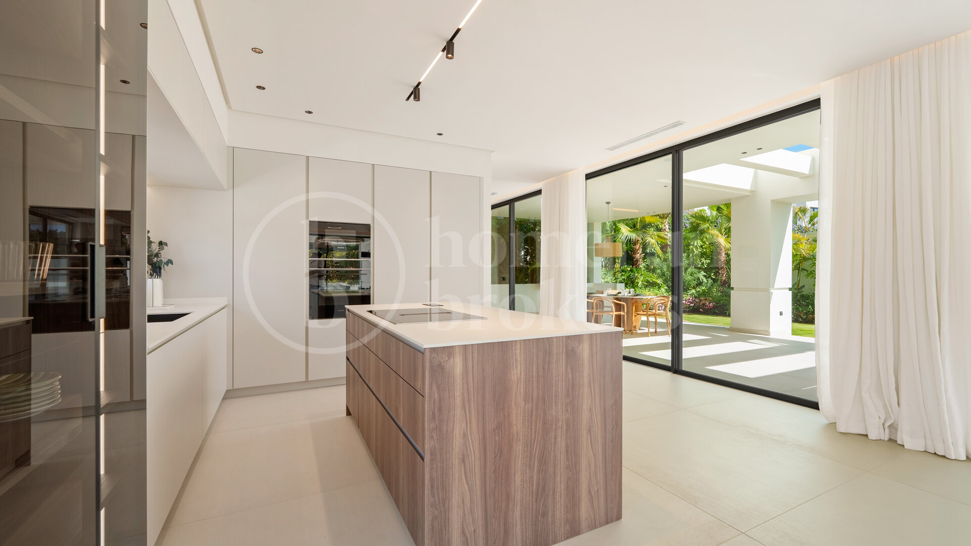 Inside, the home radiates sophistication through clean lines and an open layout. The interior design embraces natural tones and textures, while floor-to-ceiling glass doors flood each space with light. The open-plan living area integrates a custom-built entertainment wall and elegant recessed lighting, creating a harmonious balance between luxury and comfort. The state-of-the-art kitchen is both practical and aesthetic, featuring a warm wooden island that contrasts beautifully with minimalist cabinetry and integrated appliances. The adjacent dining area offers an inviting space for family meals or hosting guests.