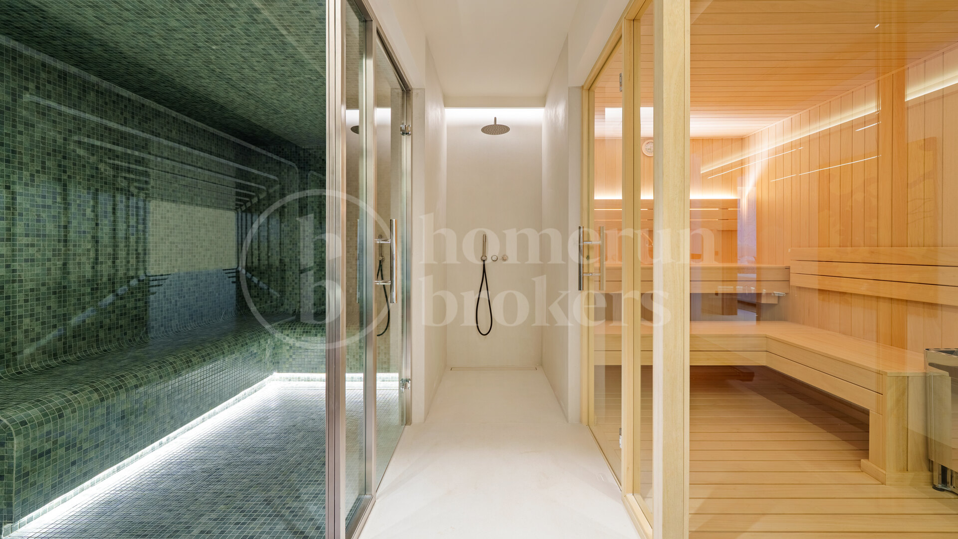 The lower level is dedicated to wellness and leisure, featuring a fully equipped gym, sauna, and glass-enclosed steam room — a personal spa designed to nurture body and mind. This floor also provides versatile space that can be adapted as a relaxation area or entertainment zone, depending on lifestyle preferences. A secure private garage ensures both convenience and discretion, complementing the property’s overall sense of exclusivity.