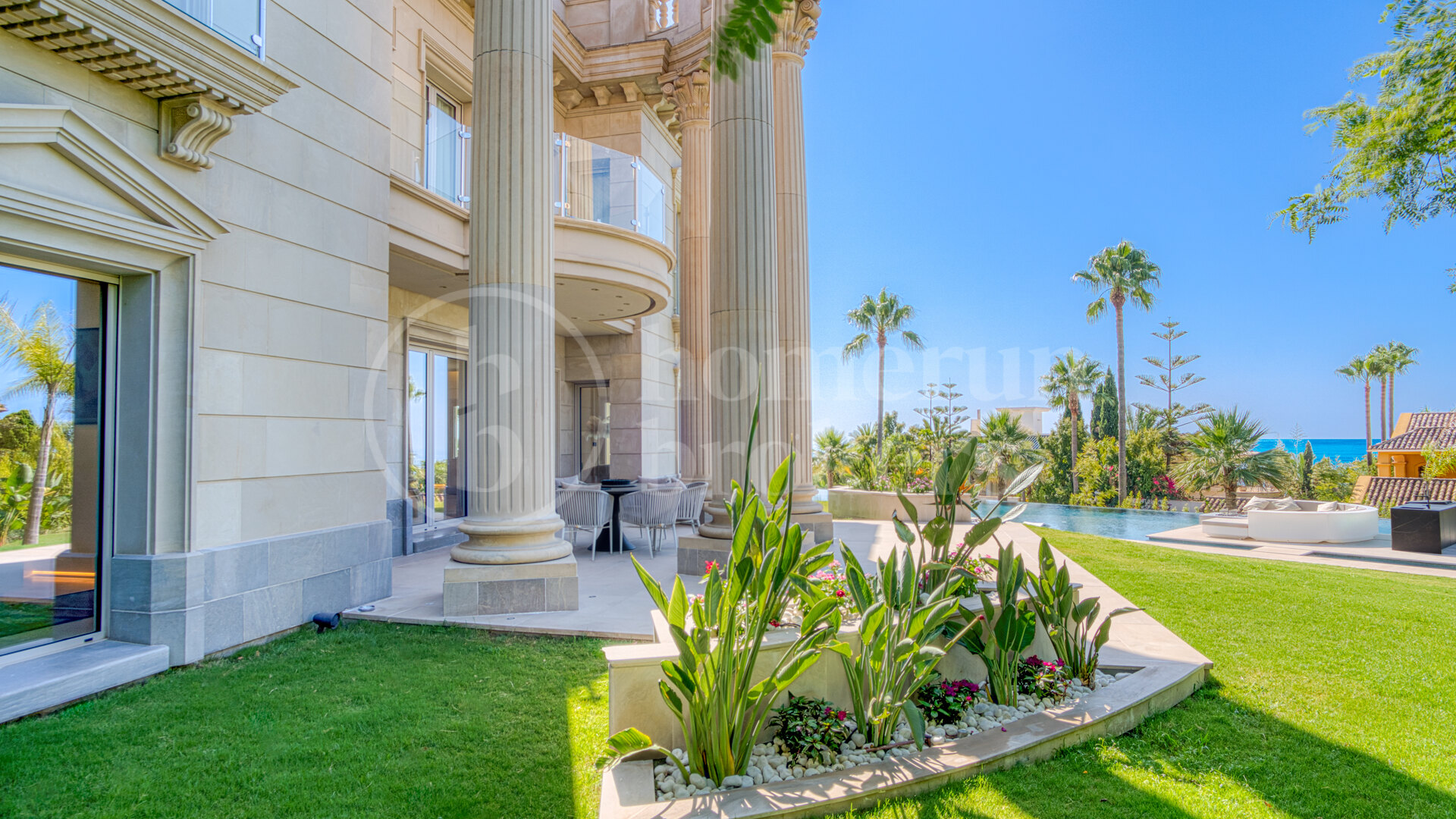 Villa Dimora distinguishes itself with an extraordinary wellness and leisure level. Here, a fully equipped private spa includes an indoor heated pool, gym, sauna, and jacuzzi. The atmosphere is serene and resort-like, tailored for residents who prioritise health, relaxation and year-round enjoyment. Outside, the landscaped plot is anchored by one of the largest heated swimming pools in Spain. Surrounded by sunbathing platforms and quiet lounge areas, the exterior setting encourages a lifestyle spent outdoors, whether for relaxation or hosting memorable gatherings.