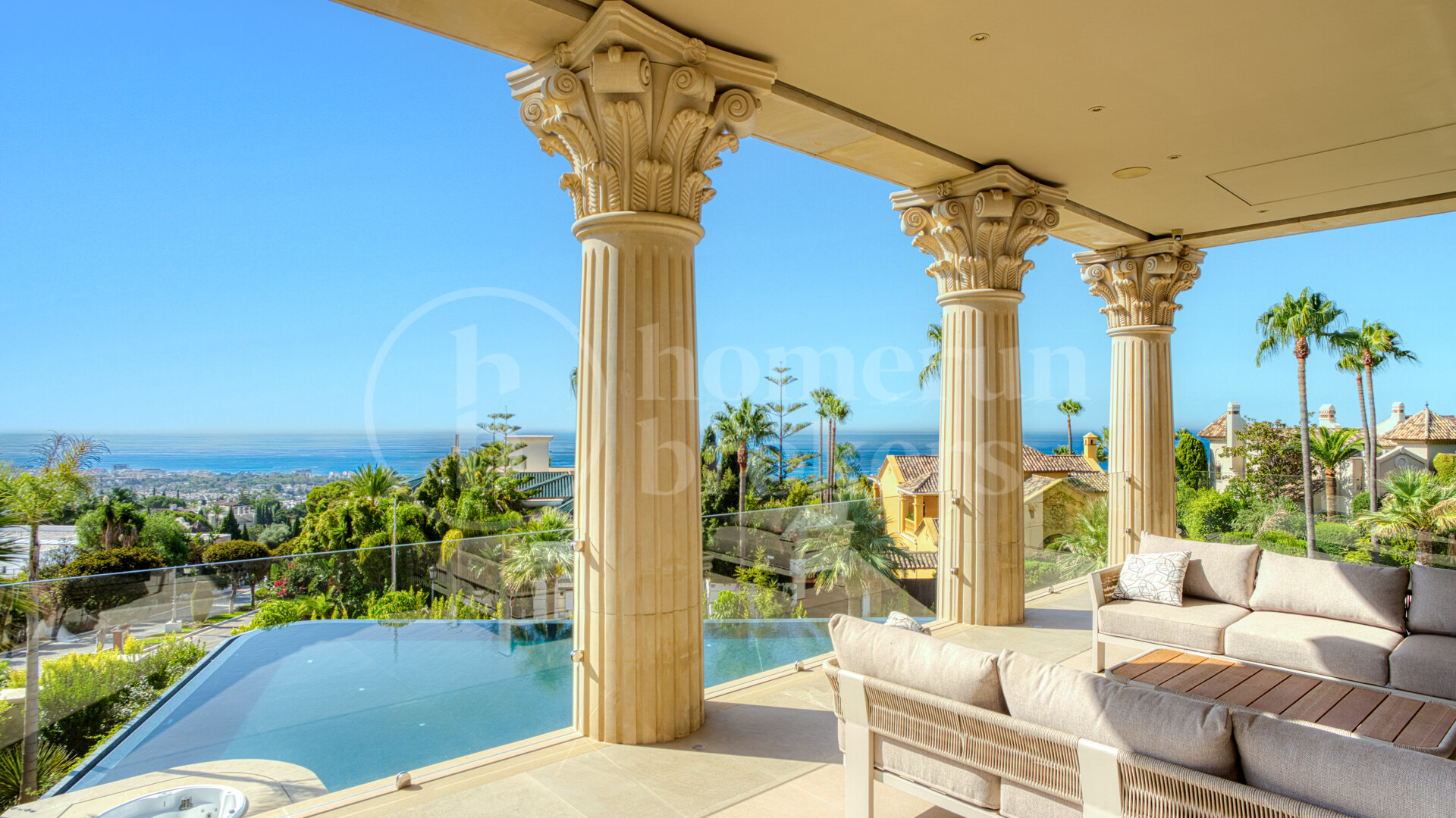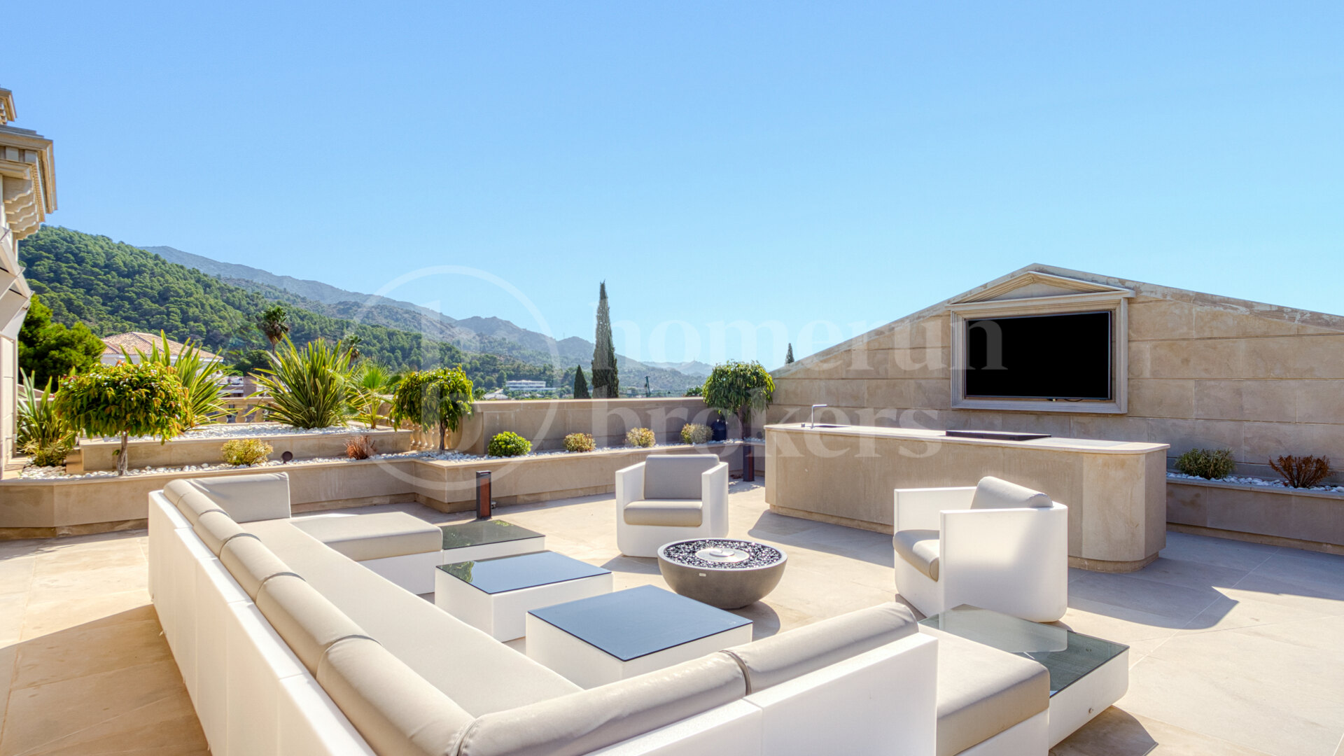 The rooftop level is designed as a destination in its own right. A spectacular open-air cinema, an outdoor kitchen and unobstructed views stretching from the coastline to the mountains make it one of the most impressive terraces within Sierra Blanca. The vantage point captures the full drama of the landscape, particularly at sunset when the colours of the sky reflect on the sea.