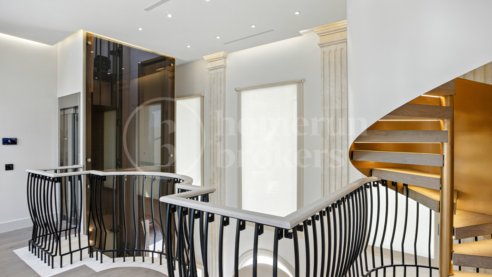The property spans four levels, all connected by a high-spec elevator, and presents a total of seven bedrooms, including two independent guest apartments that offer both discretion and comfort for visitors. A dramatic entrance sets the tone for the home’s aesthetic, where contemporary geometry is enhanced by handcrafted European details. Premium natural stone floors flow through the interiors, while imported French limestone columns, custom Rimadesio wardrobes, solid wood doors and German-engineered fittings reinforce the home’s commitment to enduring quality.