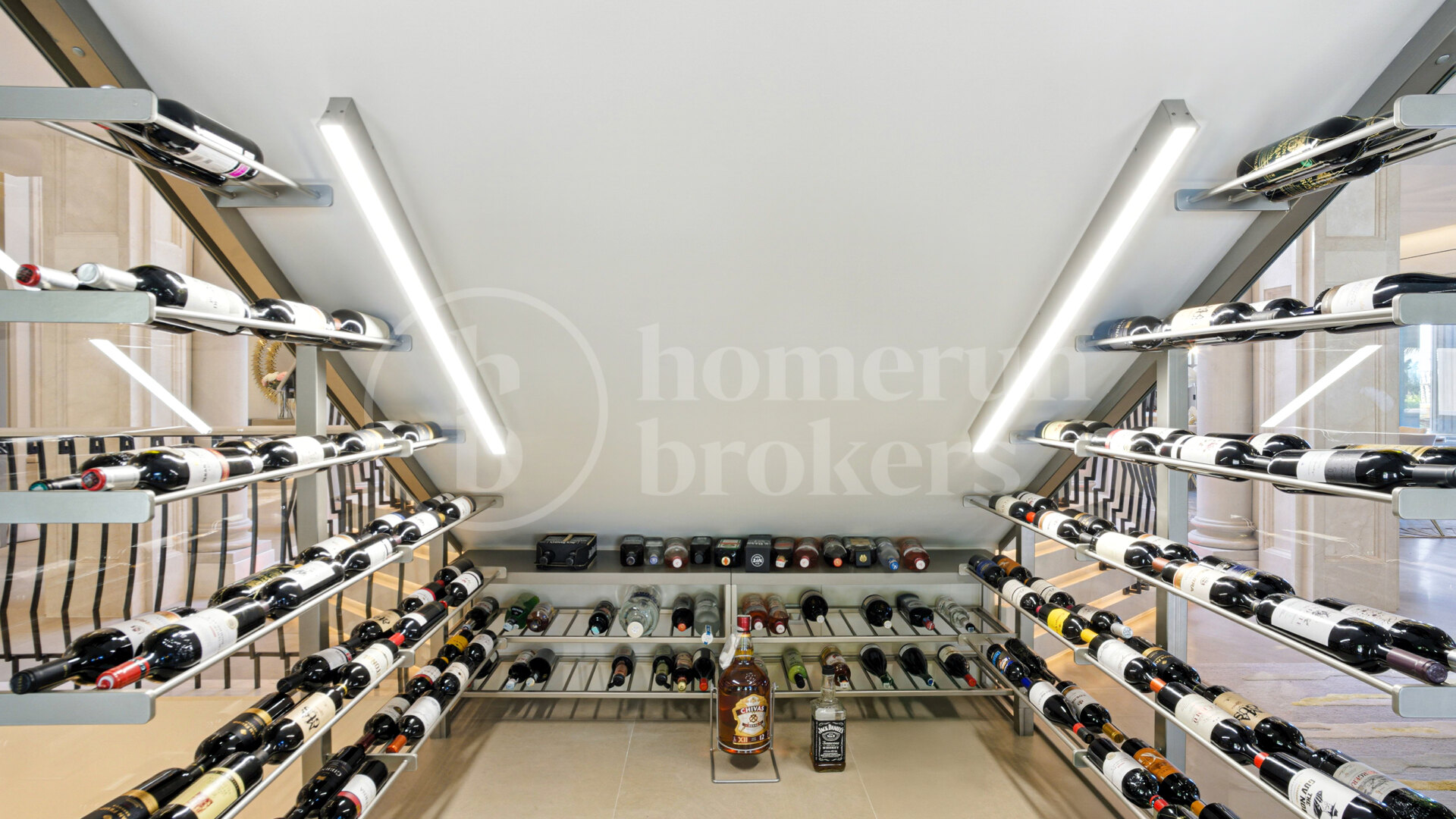 The main living areas are designed with generous proportions, creating a sense of openness and fluidity ideal for both everyday living and large-scale entertaining. The formal living room, dining area and state-of-the-art kitchen interact harmoniously, each space benefiting from extensive glazing that frames views of the Mediterranean and the surrounding leafy hills. A pair of professionally designed wine cellars offers storage for an extensive collection, catering to enthusiasts and hosts alike.