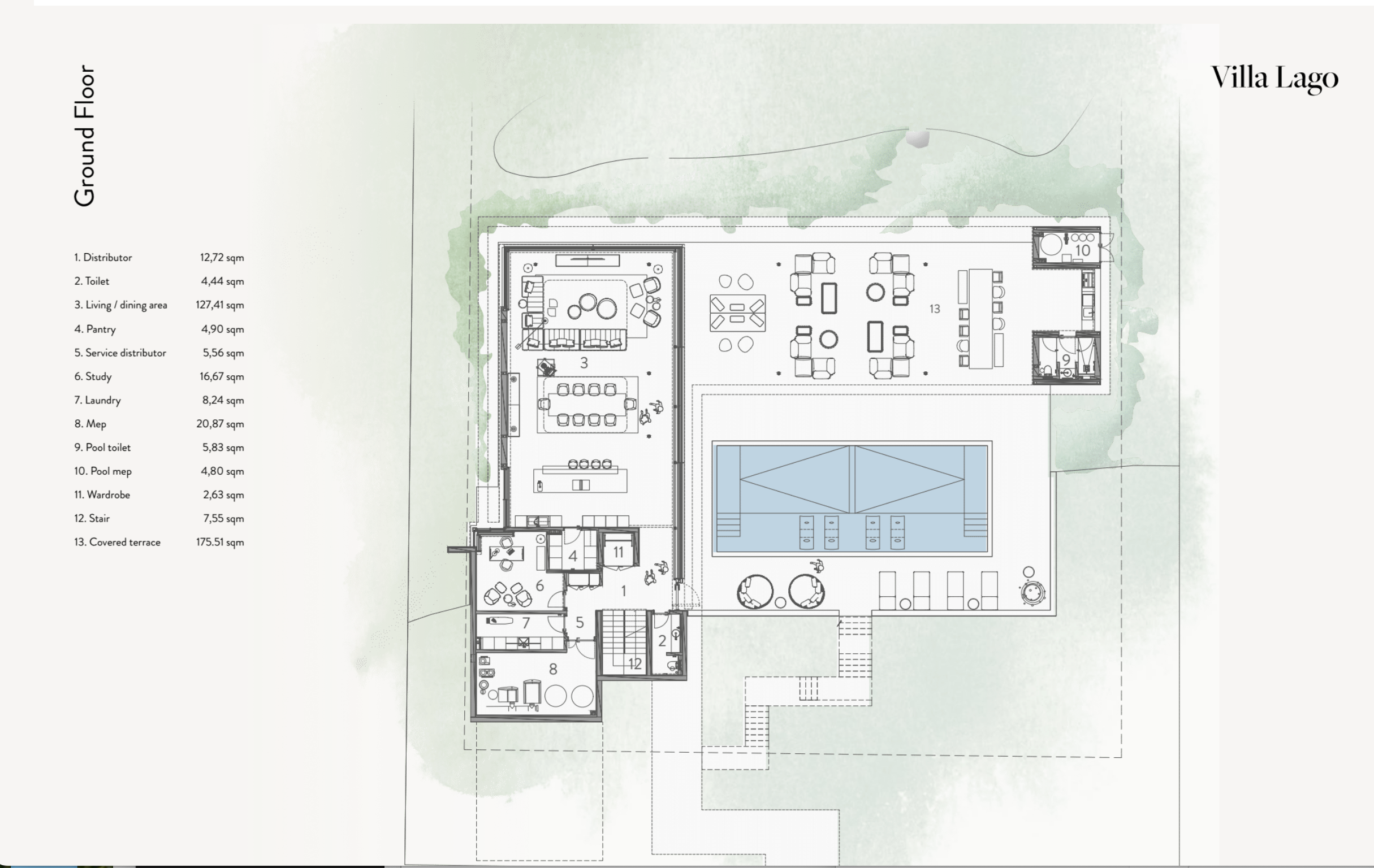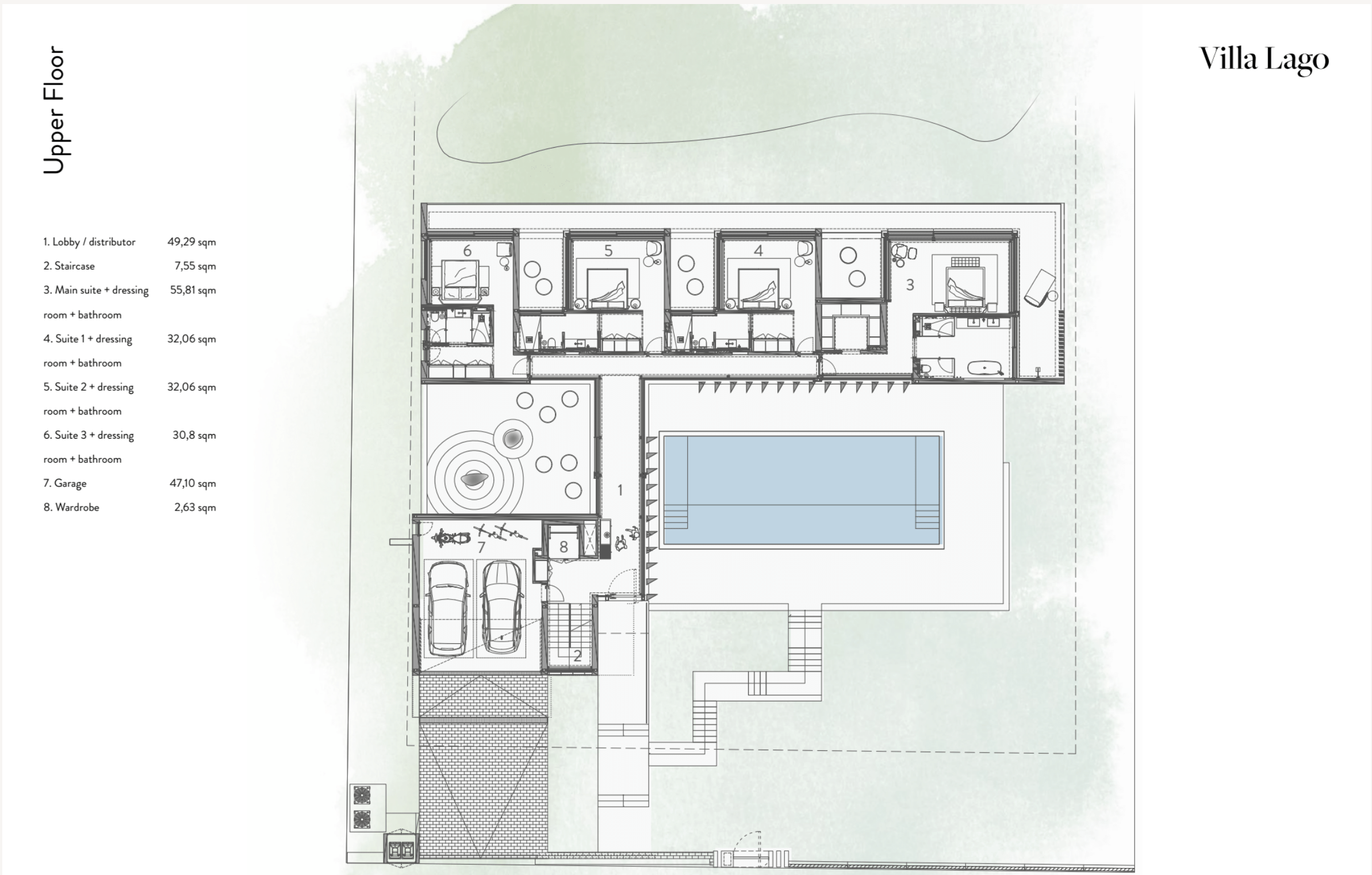 The ground floor accommodates the main living areas, including an open-plan kitchen, dining, and lounge space that flows effortlessly toward the terrace, swimming pool, and landscaped garden. The outdoor zone is thoughtfully planned with areas for sun and shade, ensuring comfort throughout the year. The terrace also features a barbecue and outdoor lounge, perfect for social gatherings or peaceful relaxation overlooking the greens.