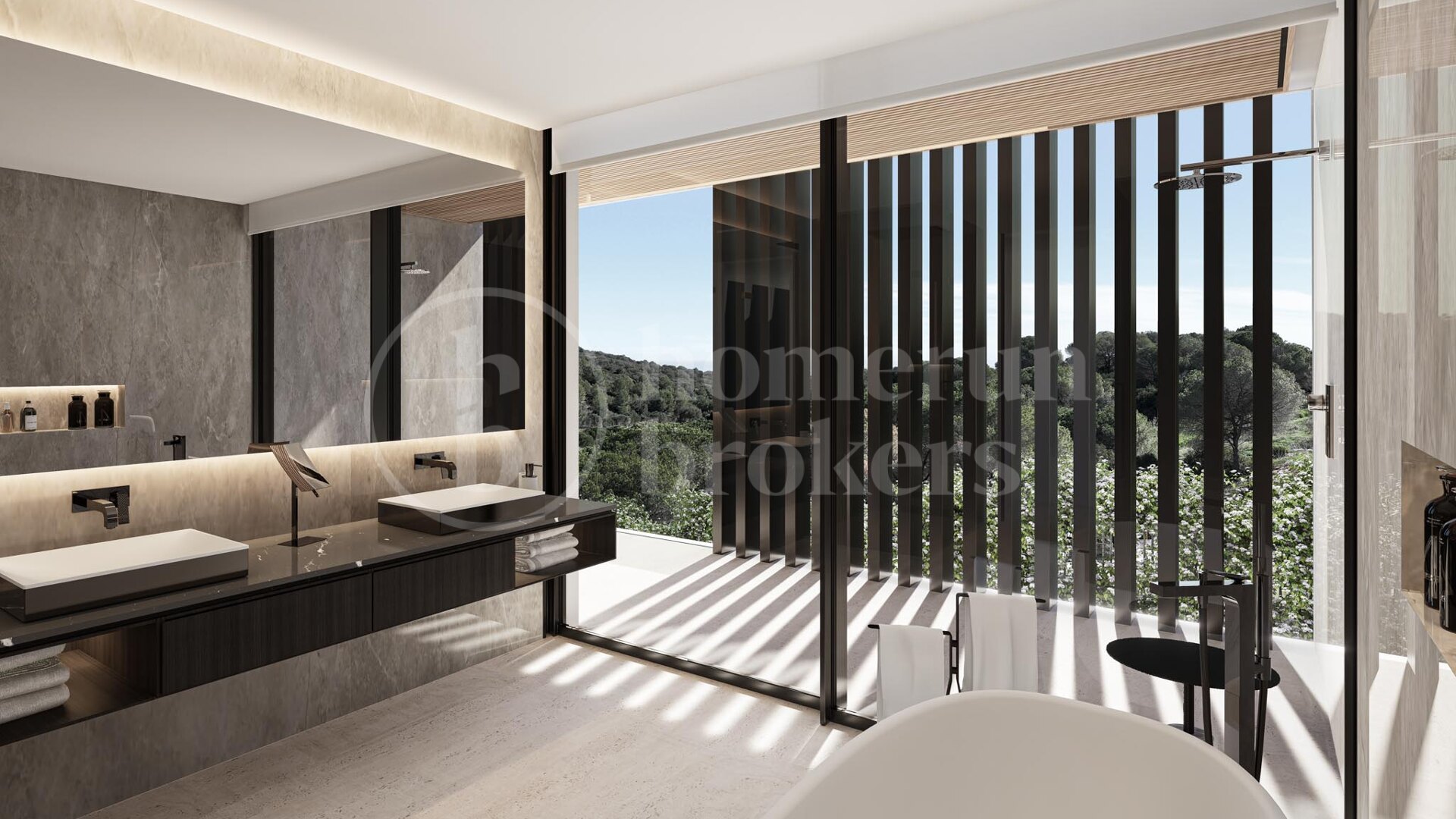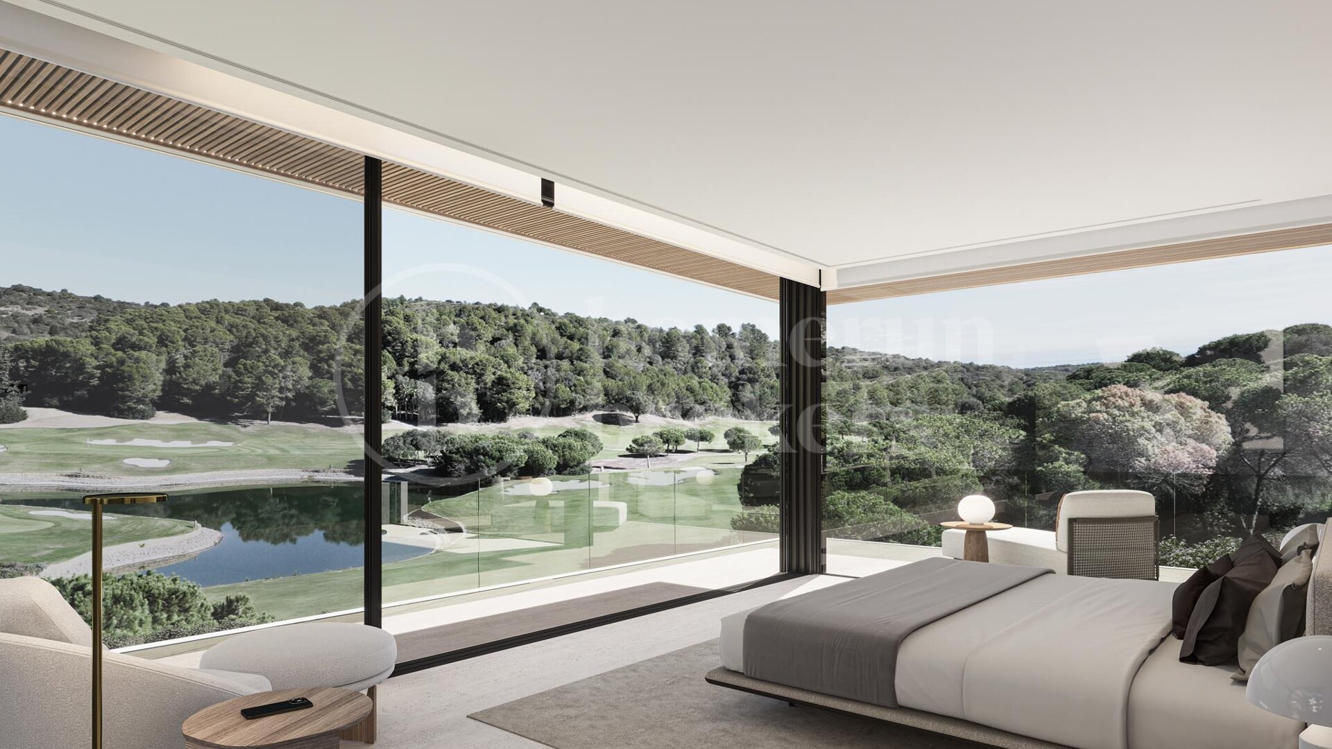 On the first floor, four en-suite bedrooms offer privacy and comfort, each with direct access to spacious private terraces facing the golf course. The master suite stands out with a dressing area, large bathroom, and sweeping views framed by nature.
