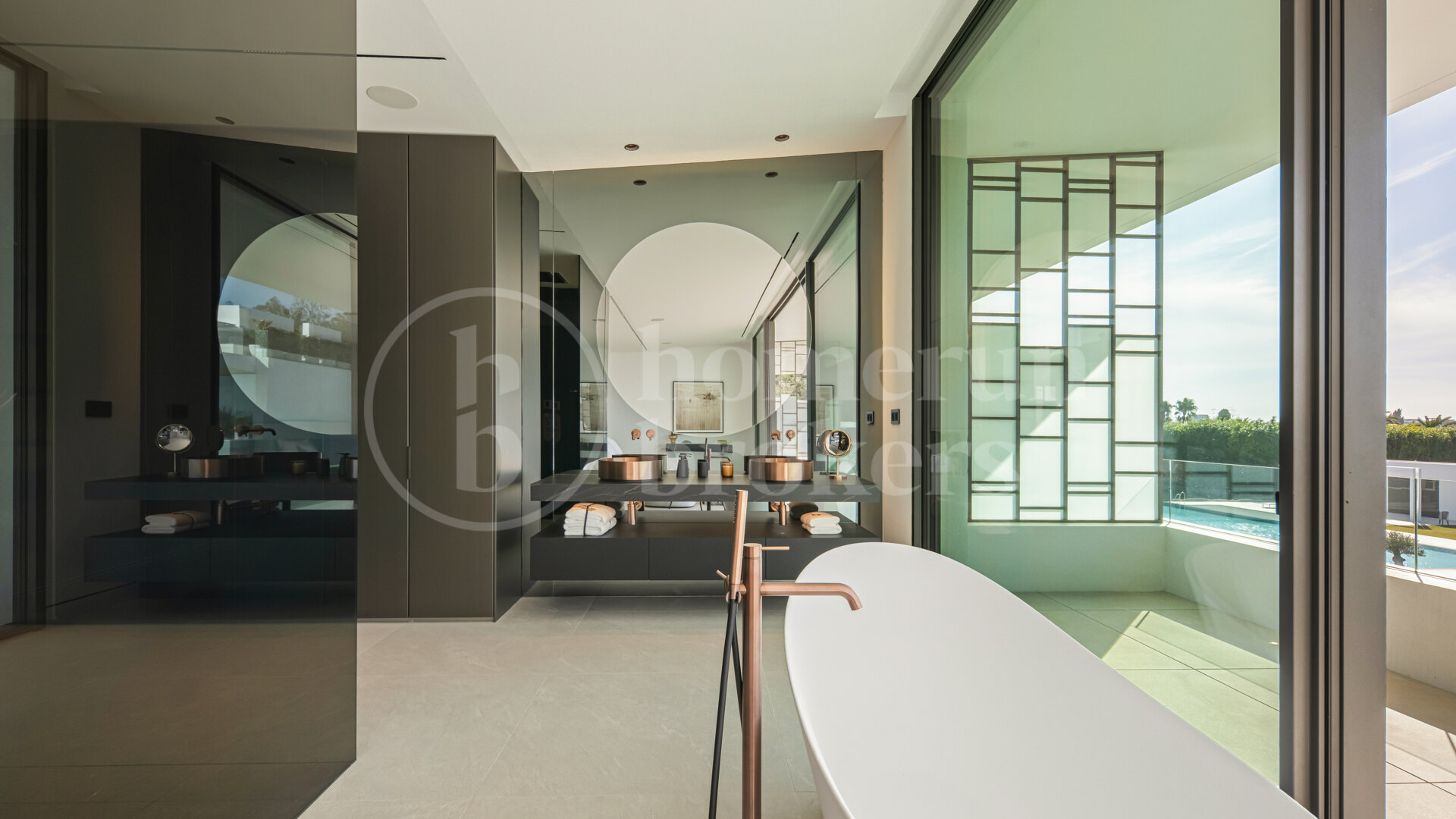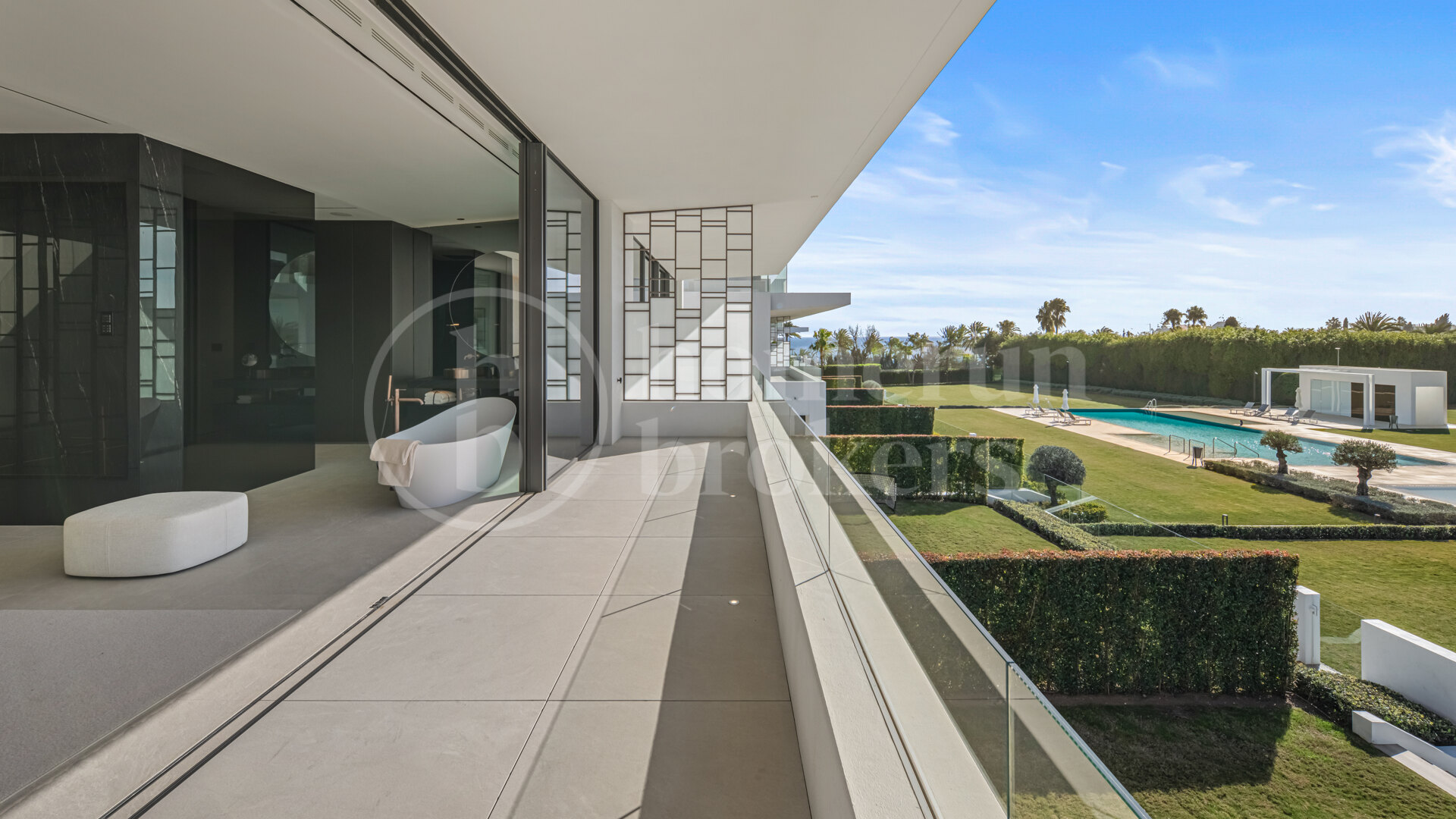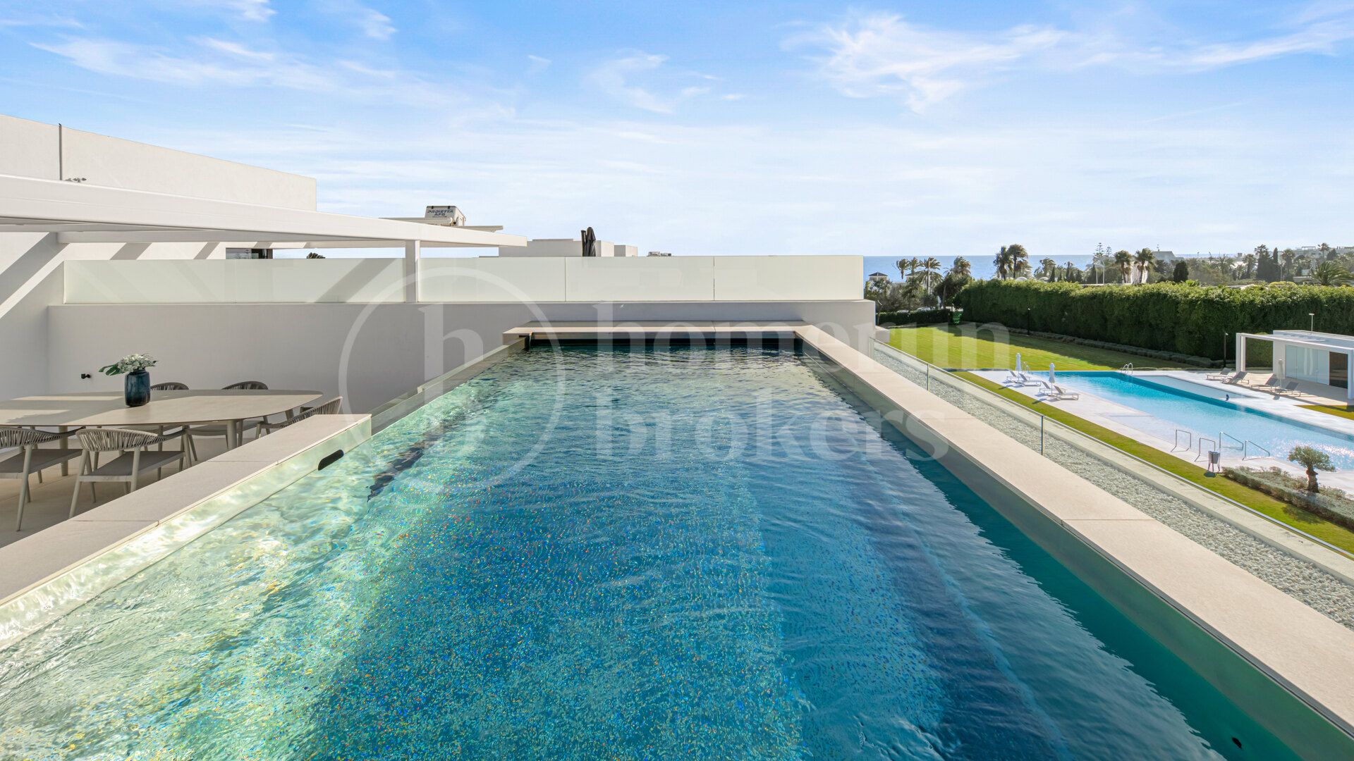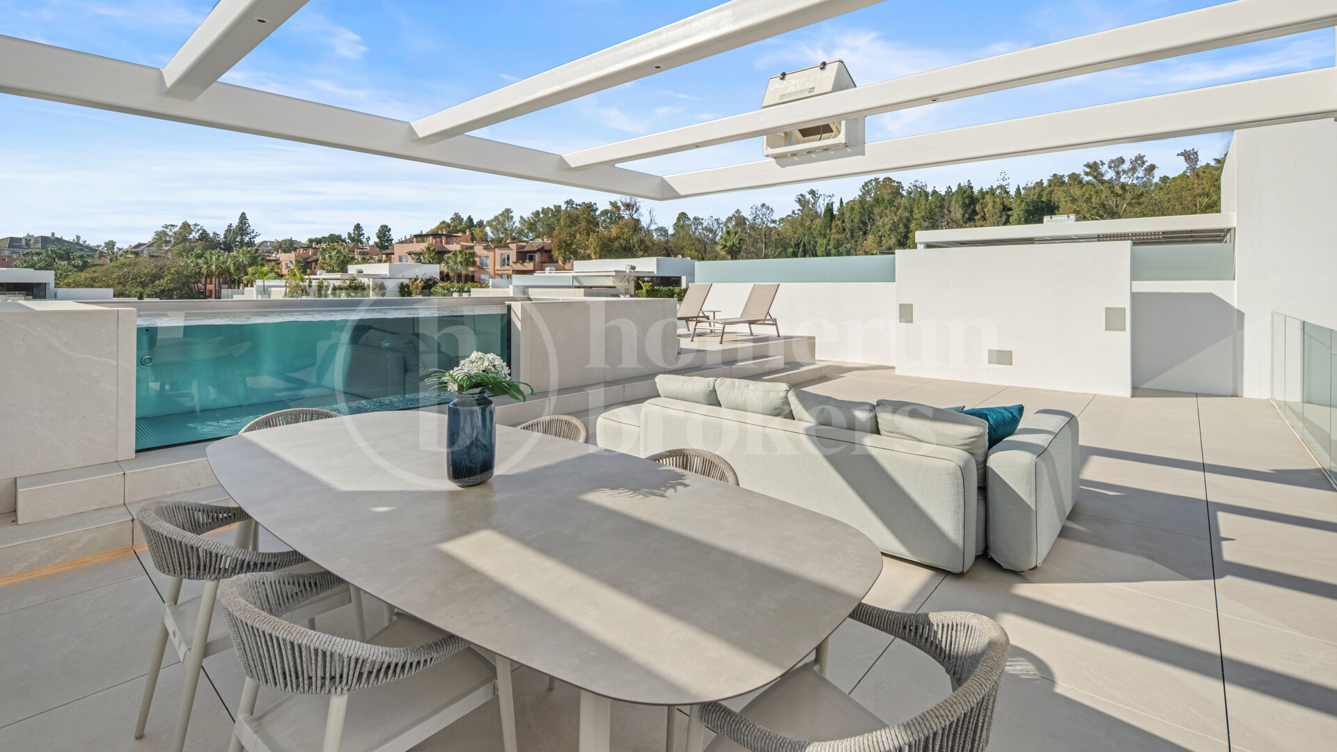 Above the main living areas, the rooftop terrace becomes one of the defining features of the property. Designed as a private outdoor retreat, this elevated level includes a swimming pool positioned along the edge of the terrace, accompanied by generous areas for sunbathing, outdoor dining and relaxed evening gatherings beneath a pergola. From here, residents enjoy open views across the Golden Mile toward the Mediterranean, making this space particularly appealing during sunset hours or social occasions.