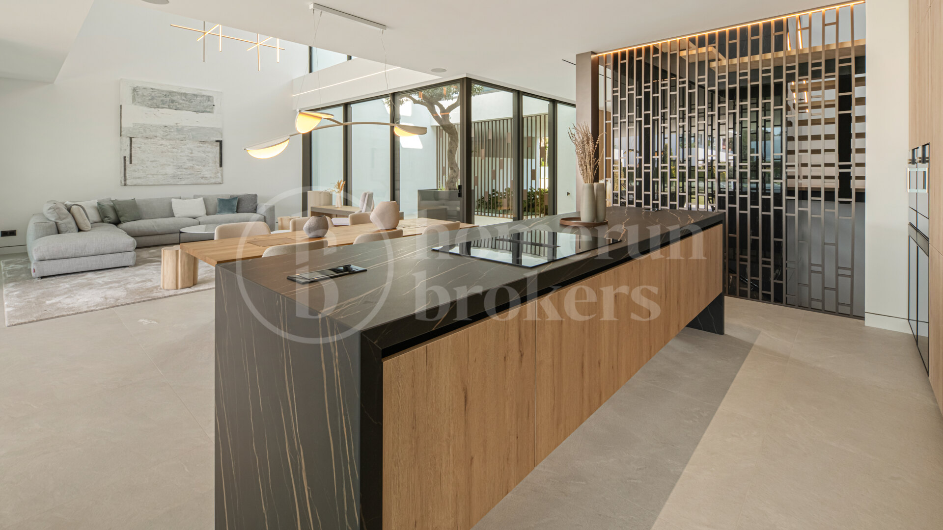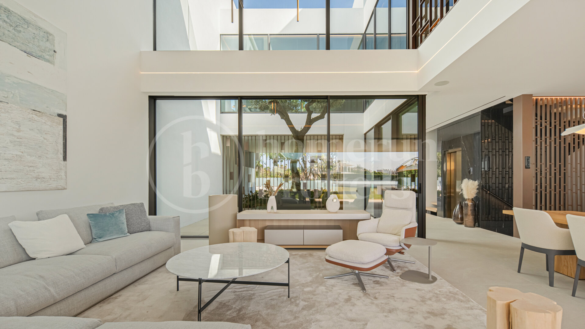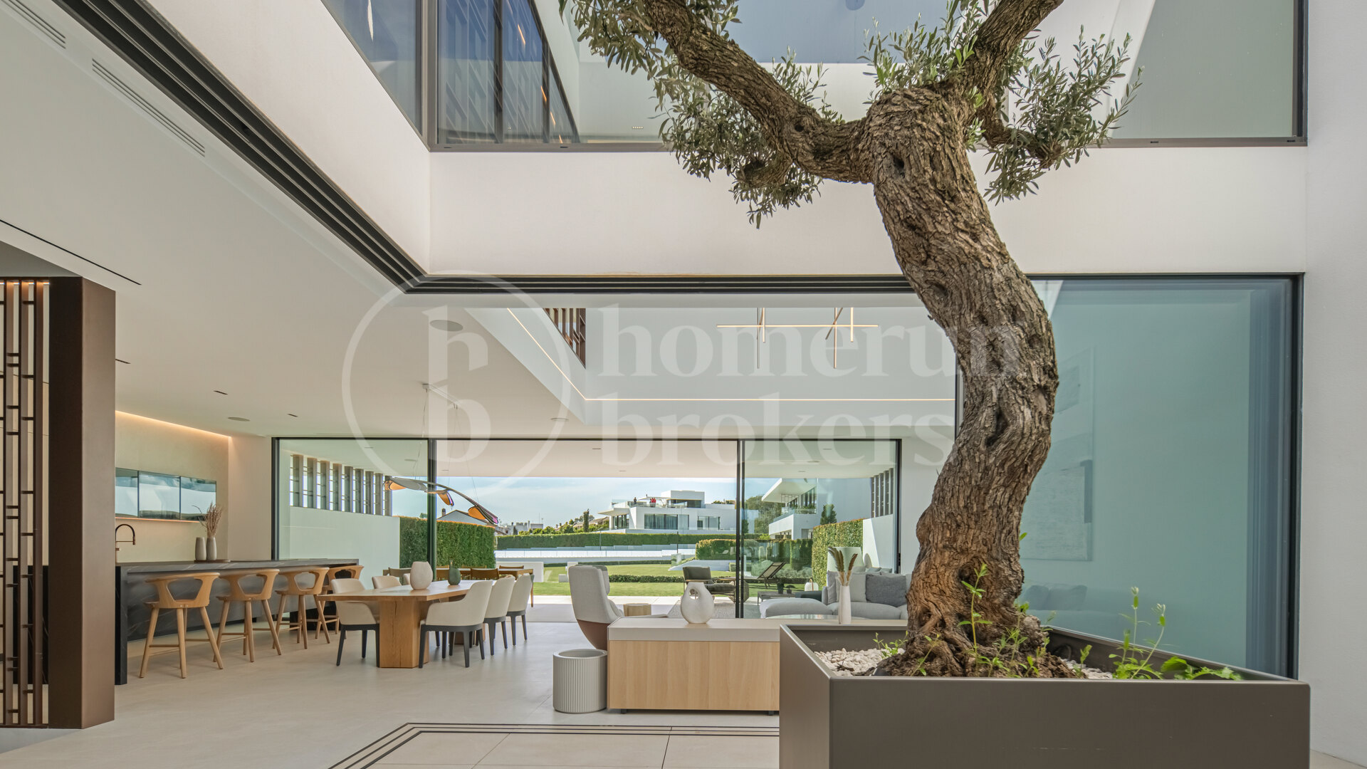 Arrival at the property introduces a carefully considered architectural concept where interior and exterior elements interact naturally. The entrance opens into a double-height living space organised around a central interior courtyard, where a mature olive tree rises through the heart of the home. This feature brings natural light and greenery into the main living area while creating a strong visual identity that defines the property. Surrounding this courtyard, the main level unfolds through a fluid open-plan layout where the kitchen, dining area and lounge connect seamlessly.