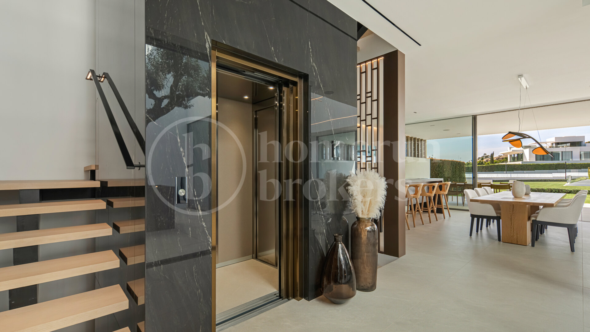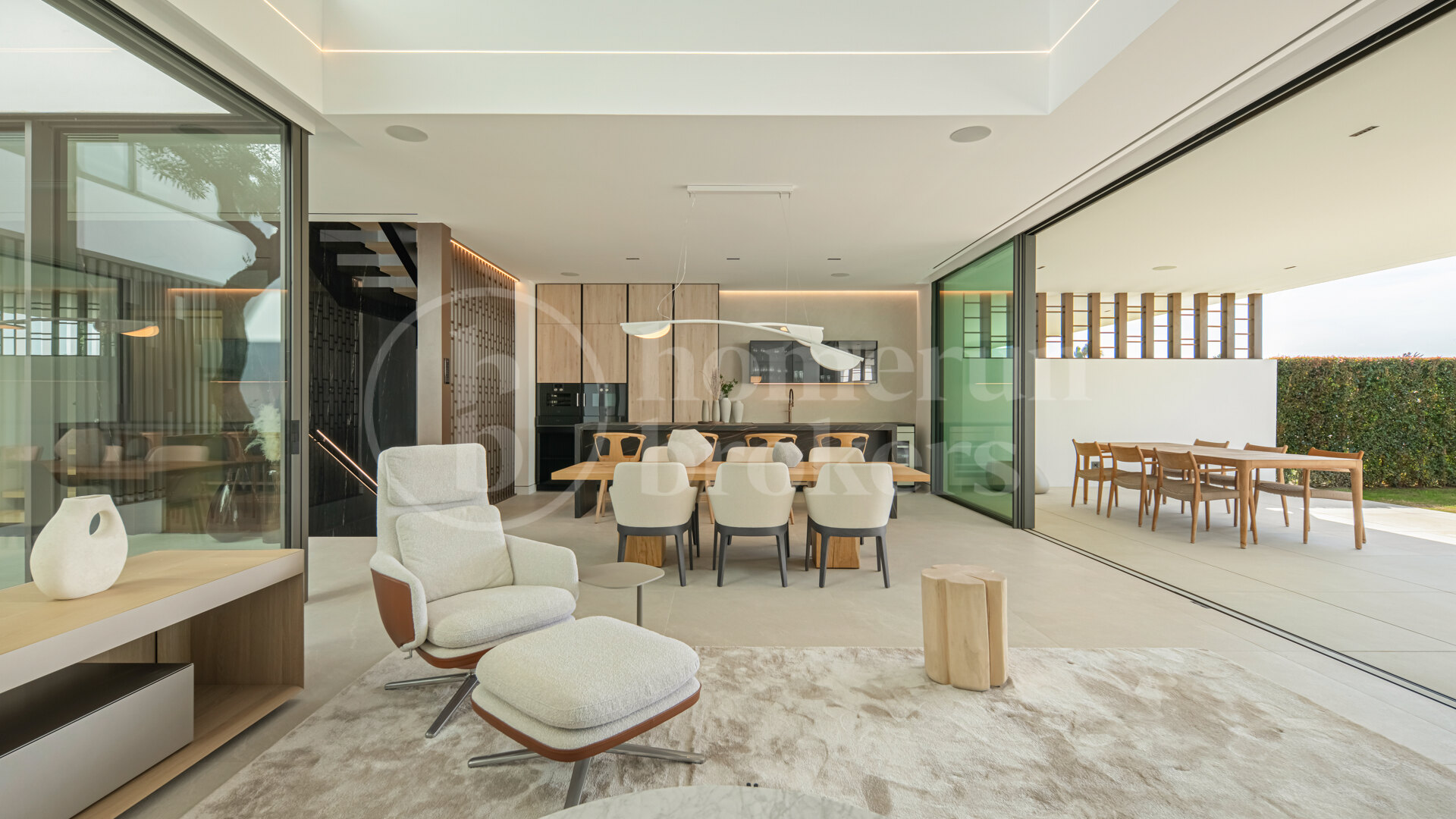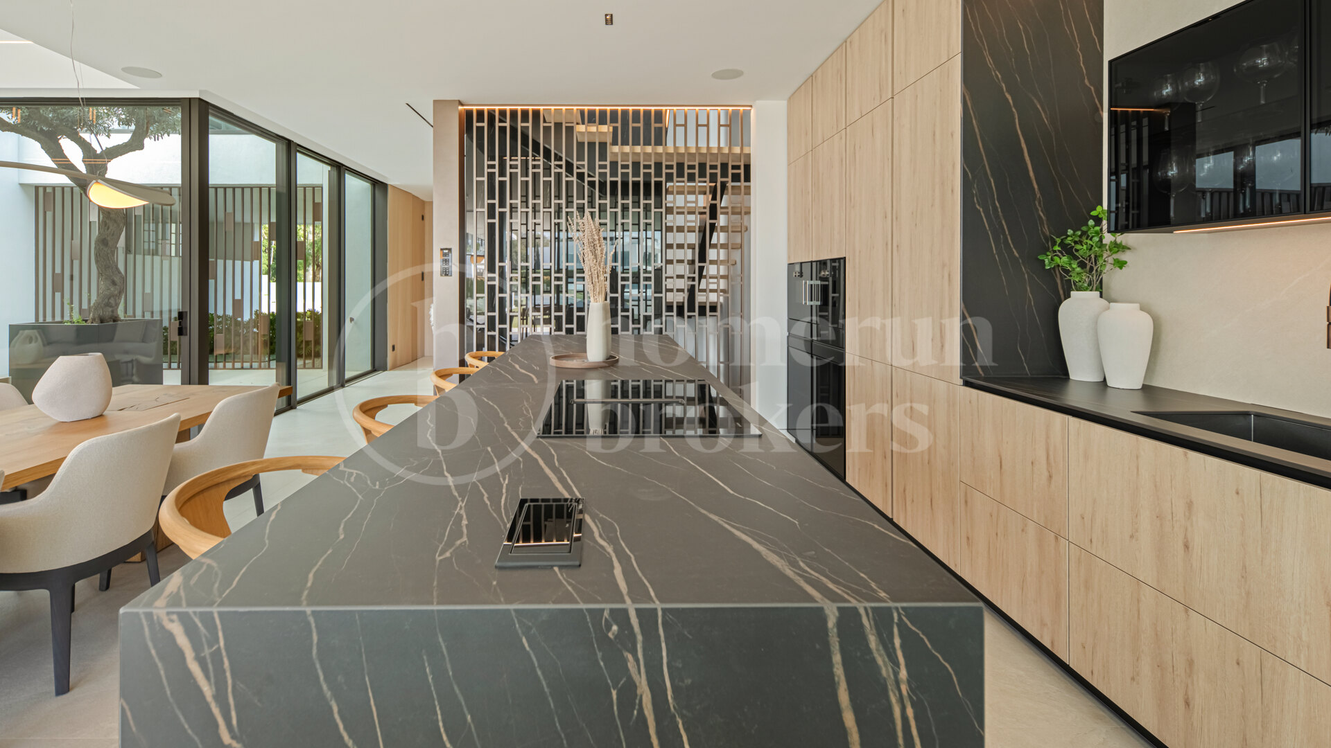 Arrival at the property introduces a carefully considered architectural concept where interior and exterior elements interact naturally. The entrance opens into a double-height living space organised around a central interior courtyard, where a mature olive tree rises through the heart of the home. This feature brings natural light and greenery into the main living area while creating a strong visual identity that defines the property. Surrounding this courtyard, the main level unfolds through a fluid open-plan layout where the kitchen, dining area and lounge connect seamlessly.