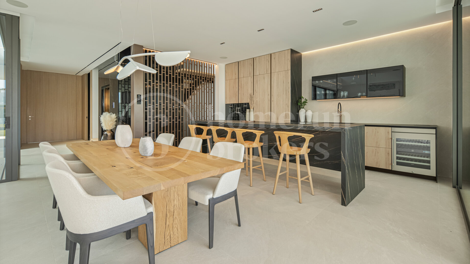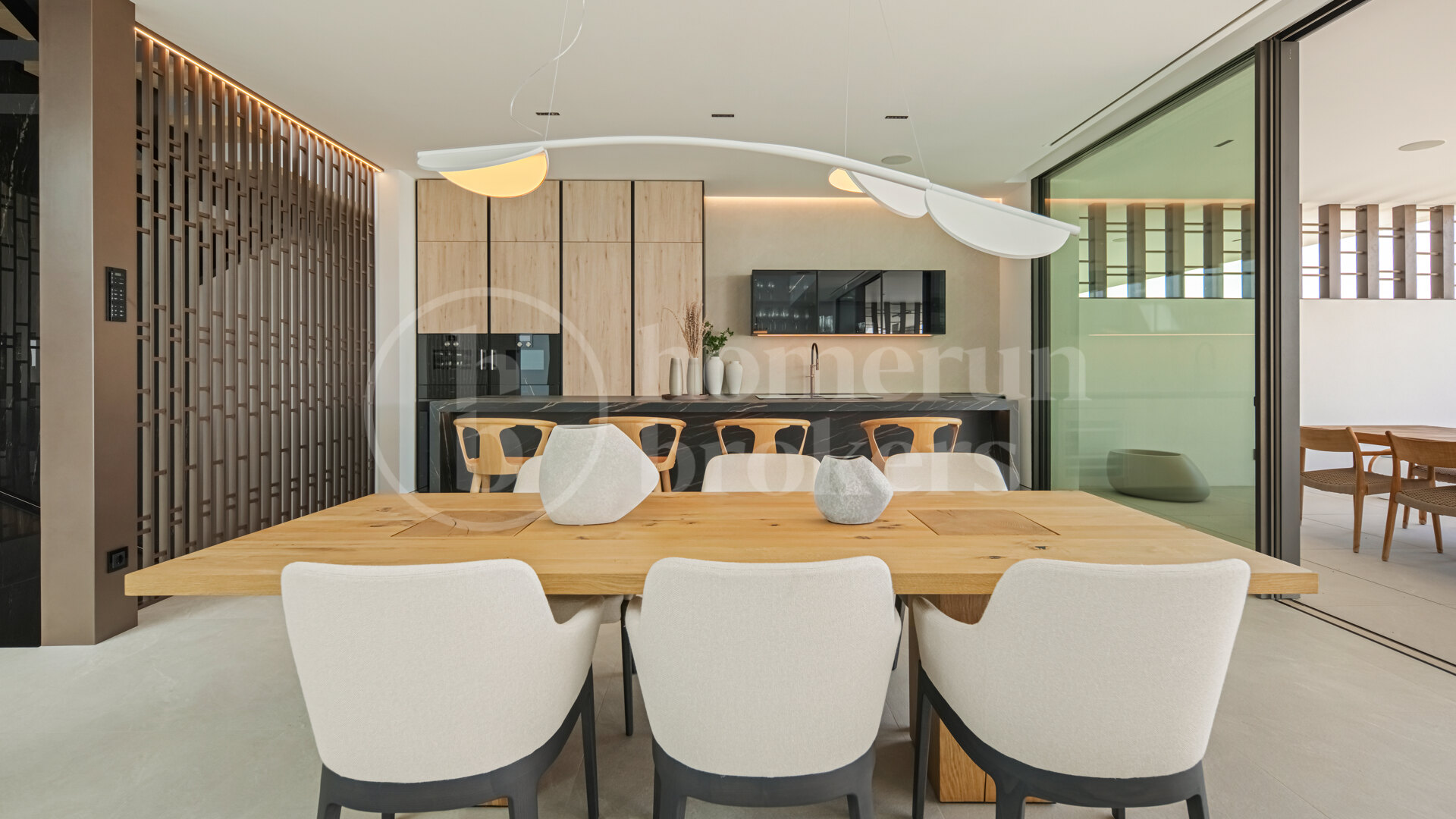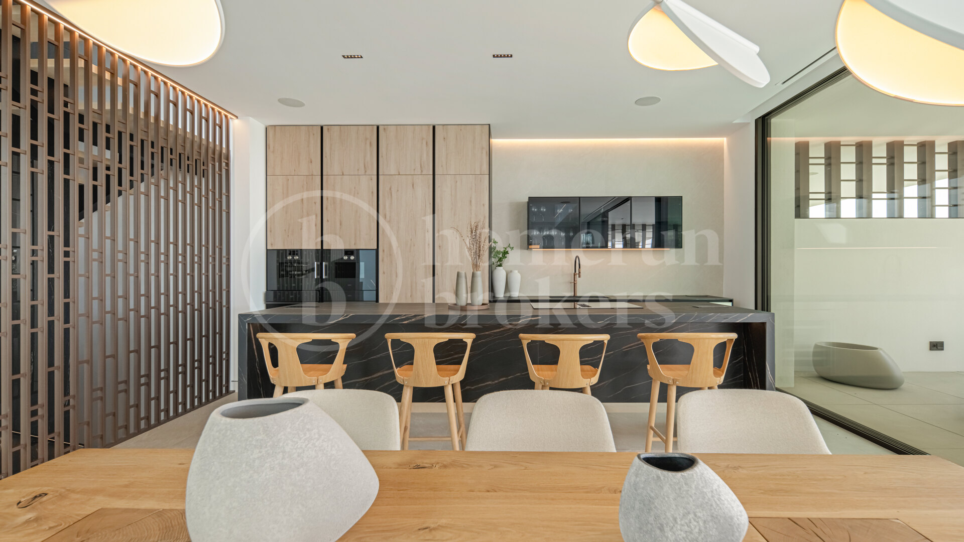 Large floor-to-ceiling sliding glass panels frame the surrounding terraces and allow the living spaces to extend naturally outdoors. Materials have been selected to maintain a calm and refined atmosphere, combining oak cabinetry, pale stone flooring and subtle architectural lighting. The result is a contemporary interior that feels warm and residential rather than purely minimalist. Outdoor terraces connected to this level provide comfortable areas for dining or relaxing while enjoying the Mediterranean climate throughout the year.
