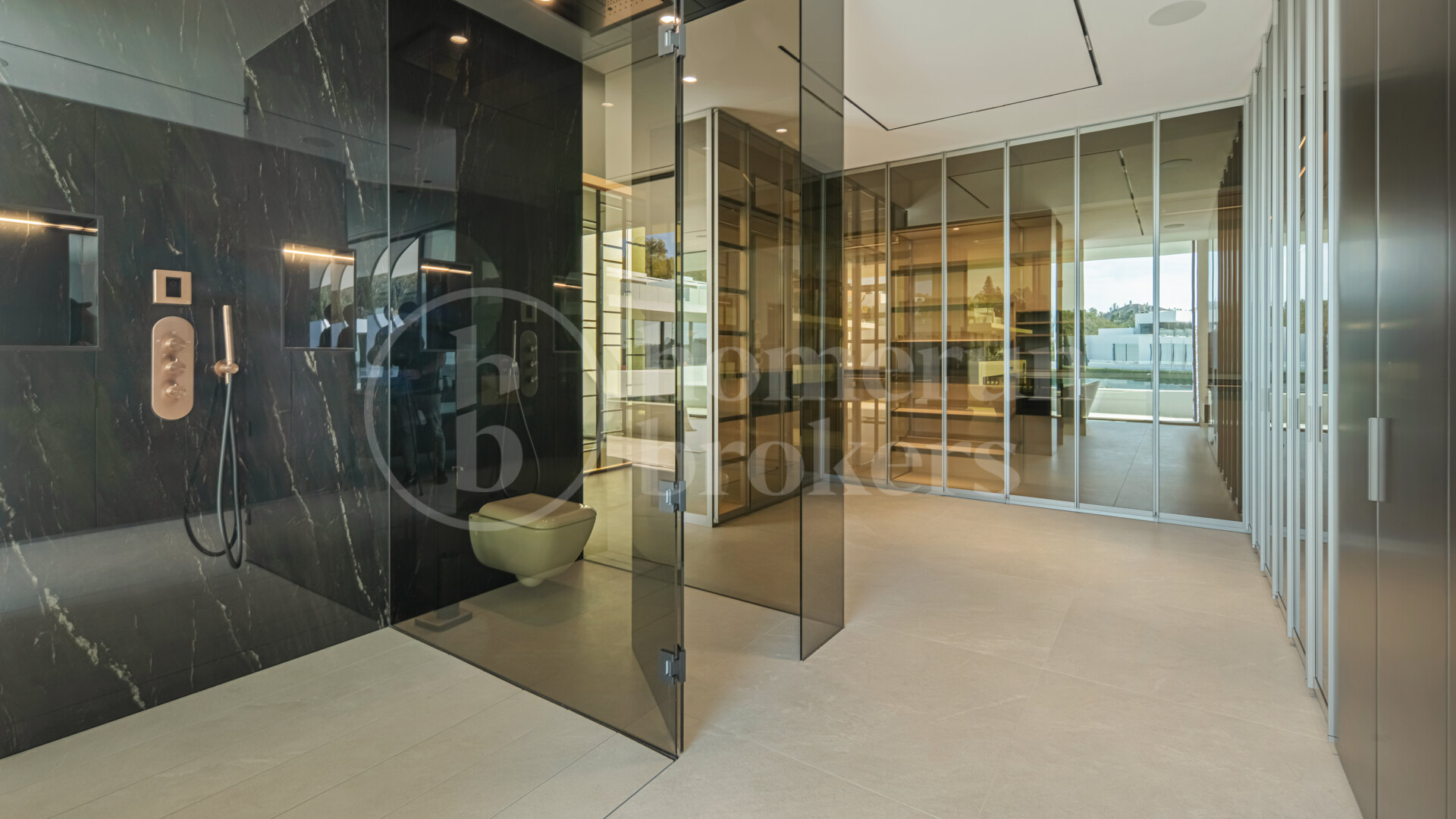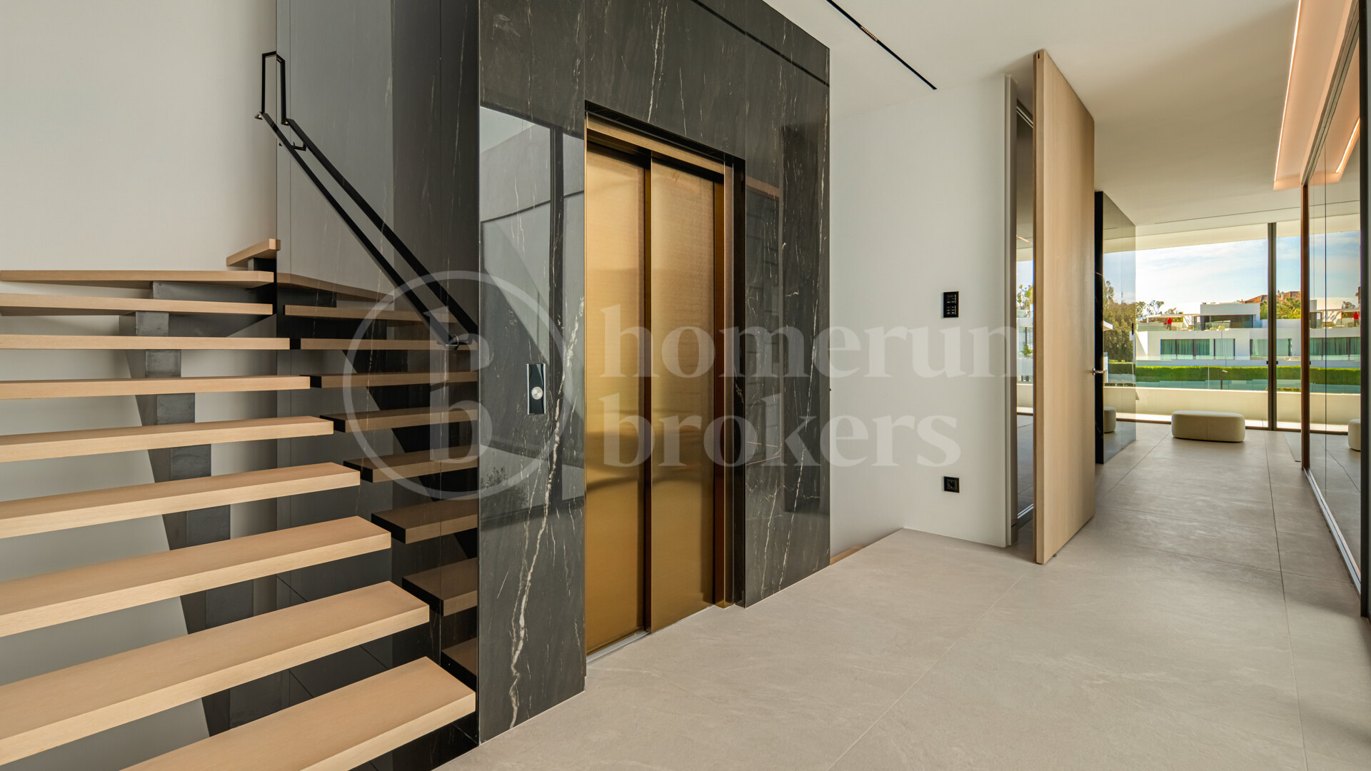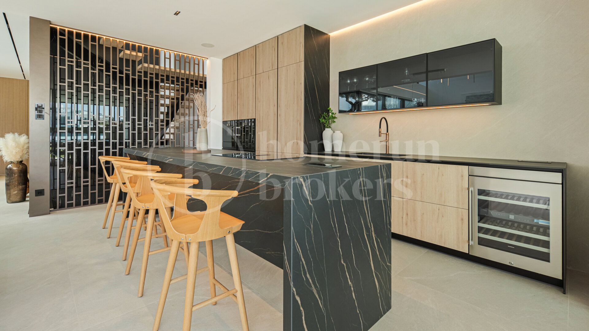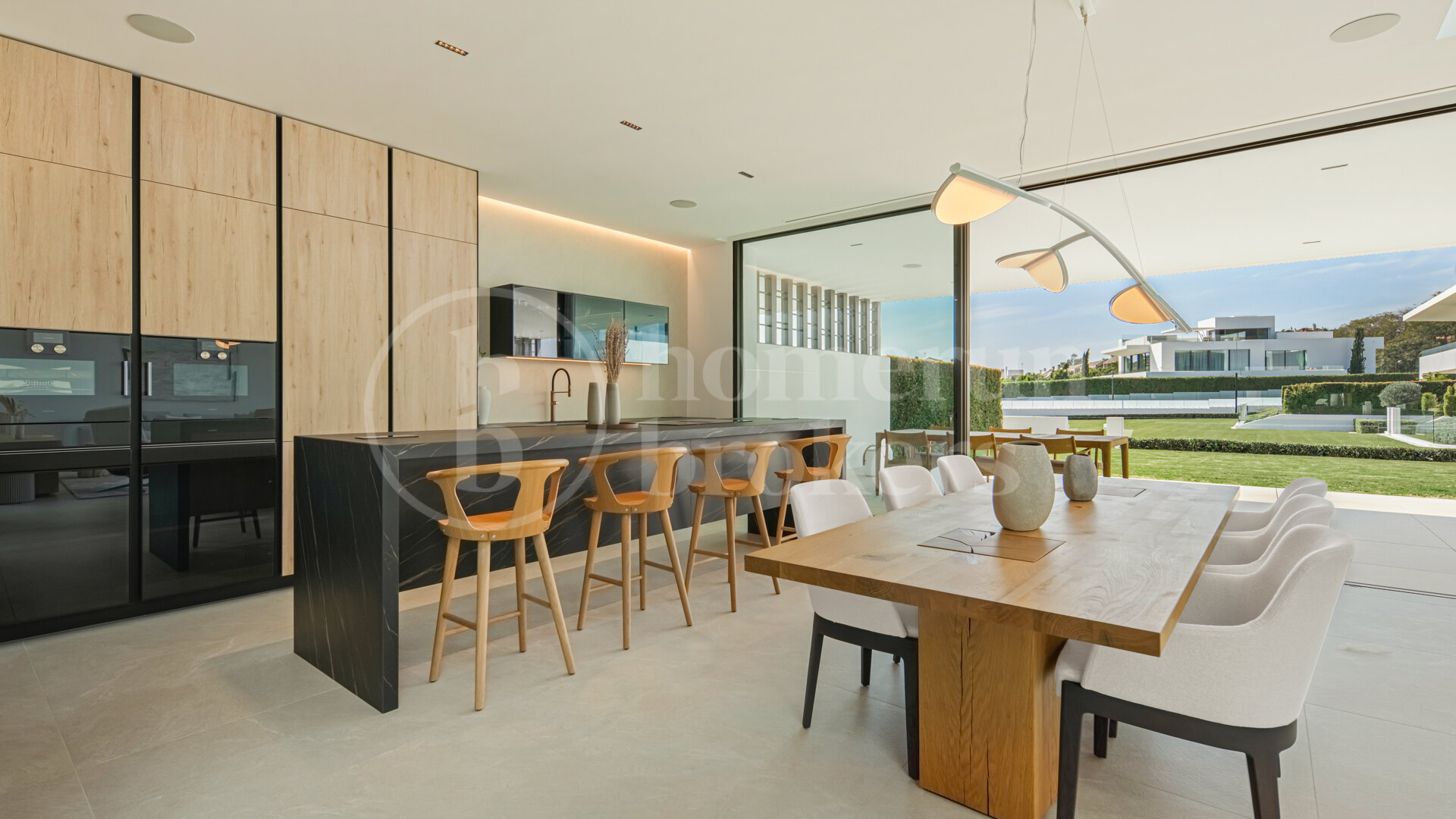 Large floor-to-ceiling sliding glass panels frame the surrounding terraces and allow the living spaces to extend naturally outdoors. Materials have been selected to maintain a calm and refined atmosphere, combining oak cabinetry, pale stone flooring and subtle architectural lighting. The result is a contemporary interior that feels warm and residential rather than purely minimalist. Outdoor terraces connected to this level provide comfortable areas for dining or relaxing while enjoying the Mediterranean climate throughout the year.