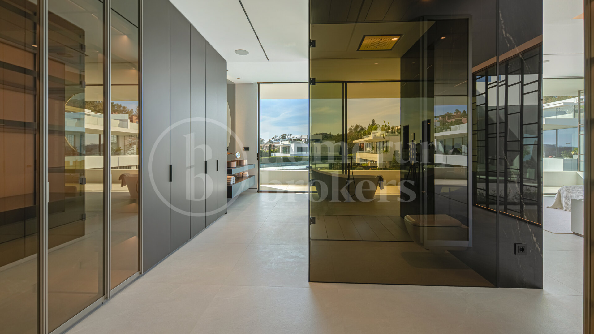 The upper floor is dedicated to the sleeping quarters, where three well-proportioned bedroom suites ensure privacy and comfort. The principal suite occupies the front façade of the villa and benefits from large windows that open toward the sea. This space includes direct terrace access, a sculptural bathroom with a freestanding bathtub and an integrated dressing area designed to maintain the clean architectural lines of the home. Two additional guest suites follow the same design language, incorporating light stone finishes, generous glazing and views toward the landscaped surroundings of the community.