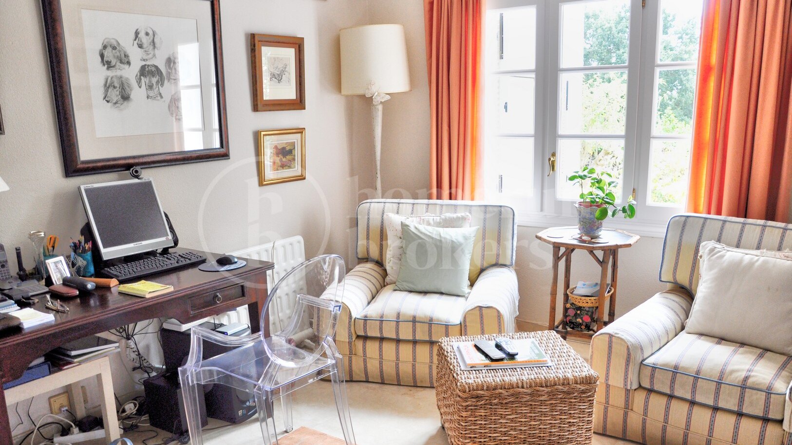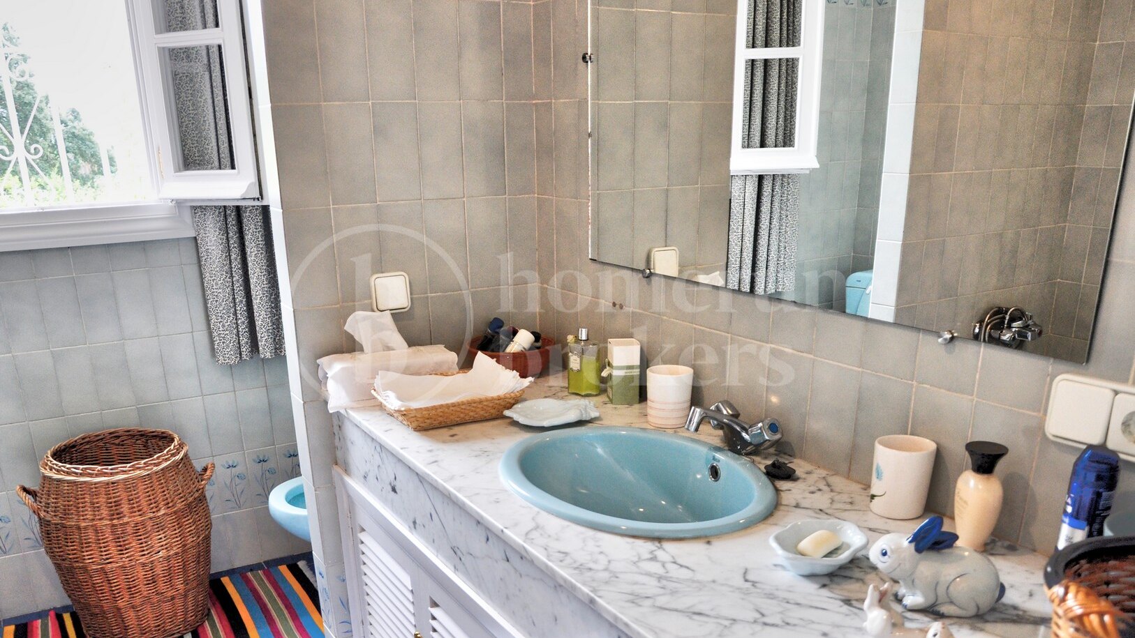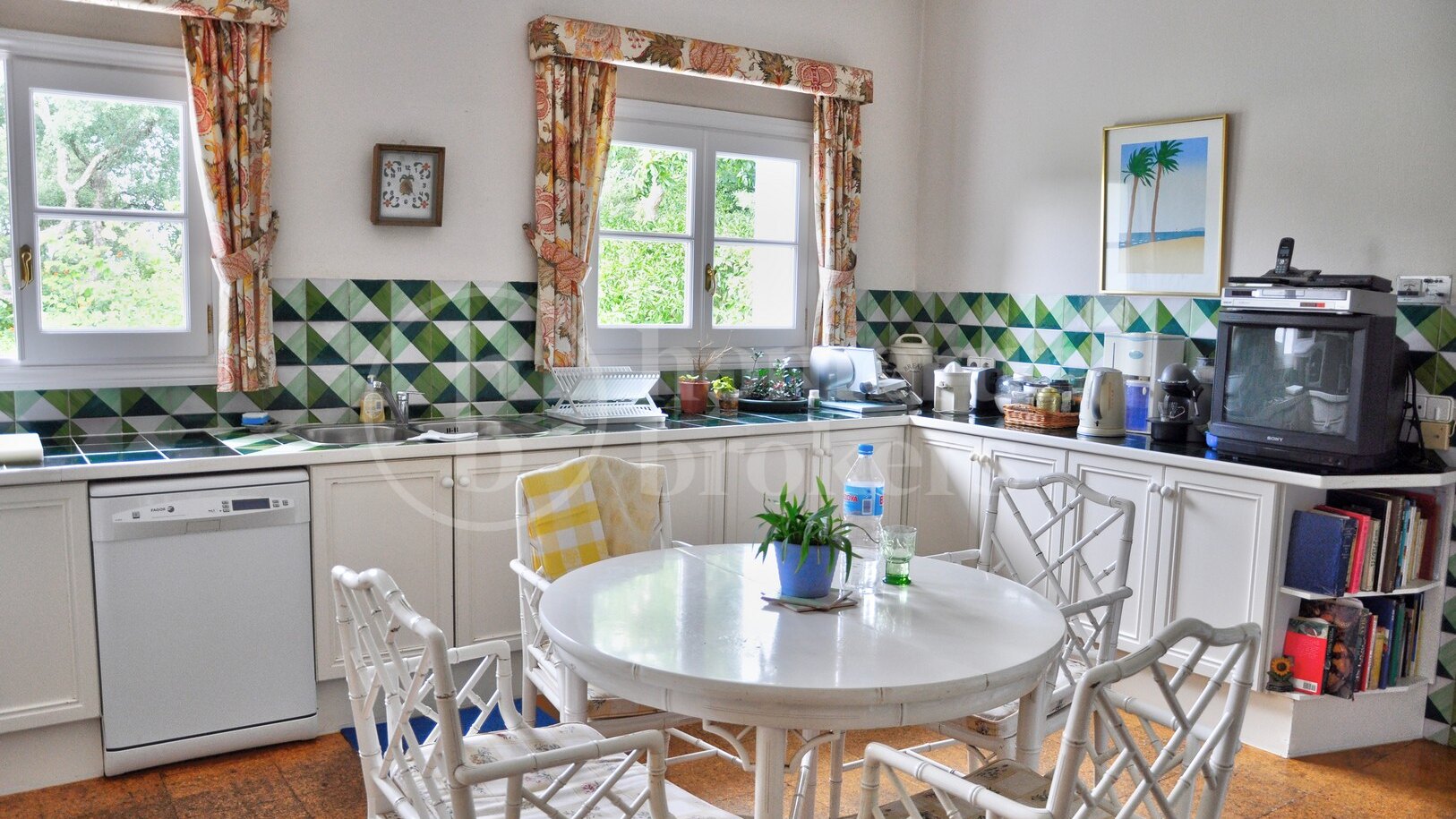 Arriving through a traditional courtyard entrance, the property immediately conveys the sense of a lived-in, well-cared-for home. The layout is designed to support everyday family life, with an open-plan living and dining area that flows directly onto the garden and pool. Large windows allow light to filter through the interior, creating continuity between indoor and outdoor spaces. The fully equipped modern kitchen complements this sociable layout, providing easy access for outdoor dining, entertaining, or simply enjoying the garden’s calm atmosphere. The villa’s mature landscaping adds privacy and character, and the private swimming pool forms the focal point of the outdoor area.