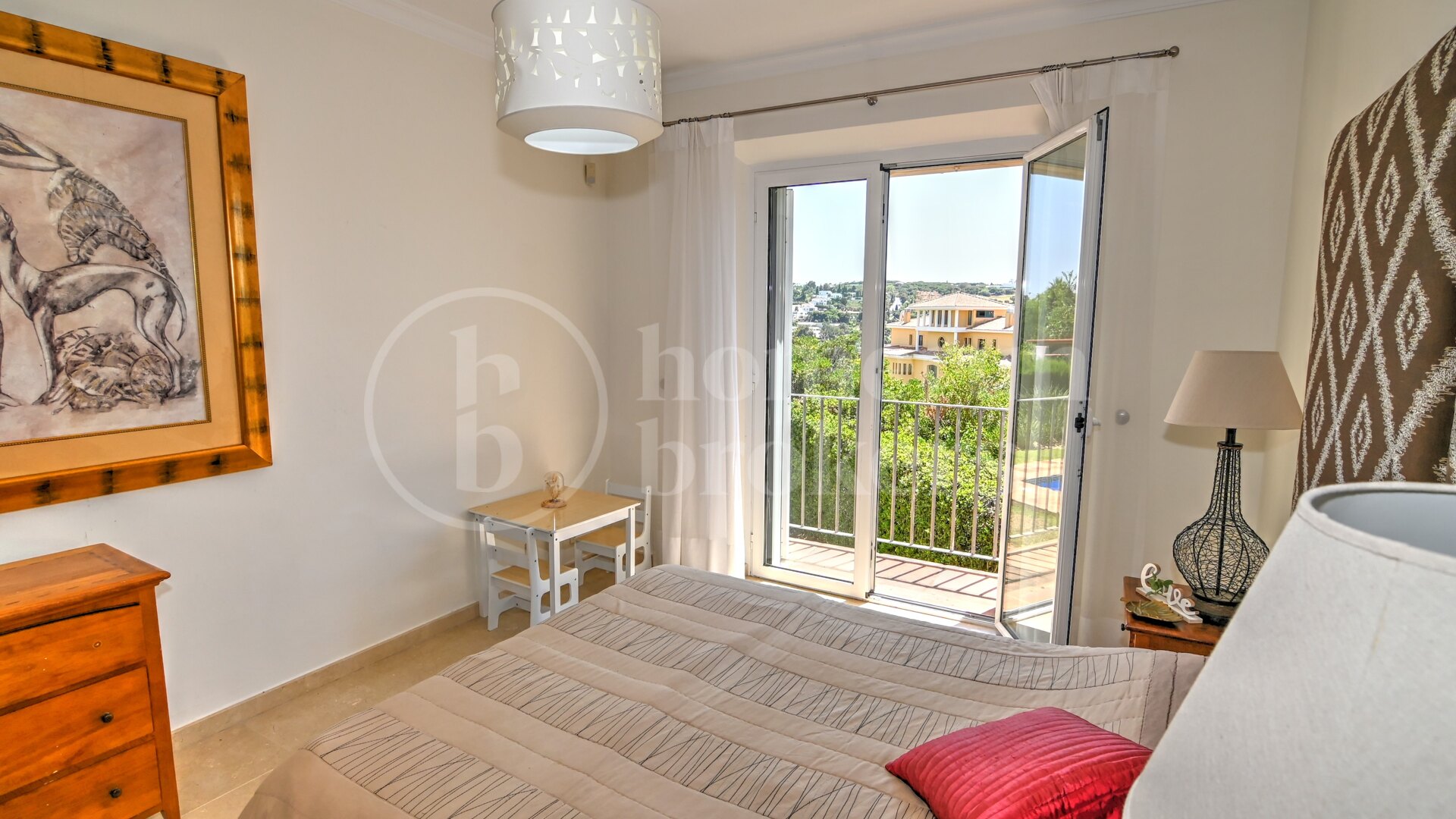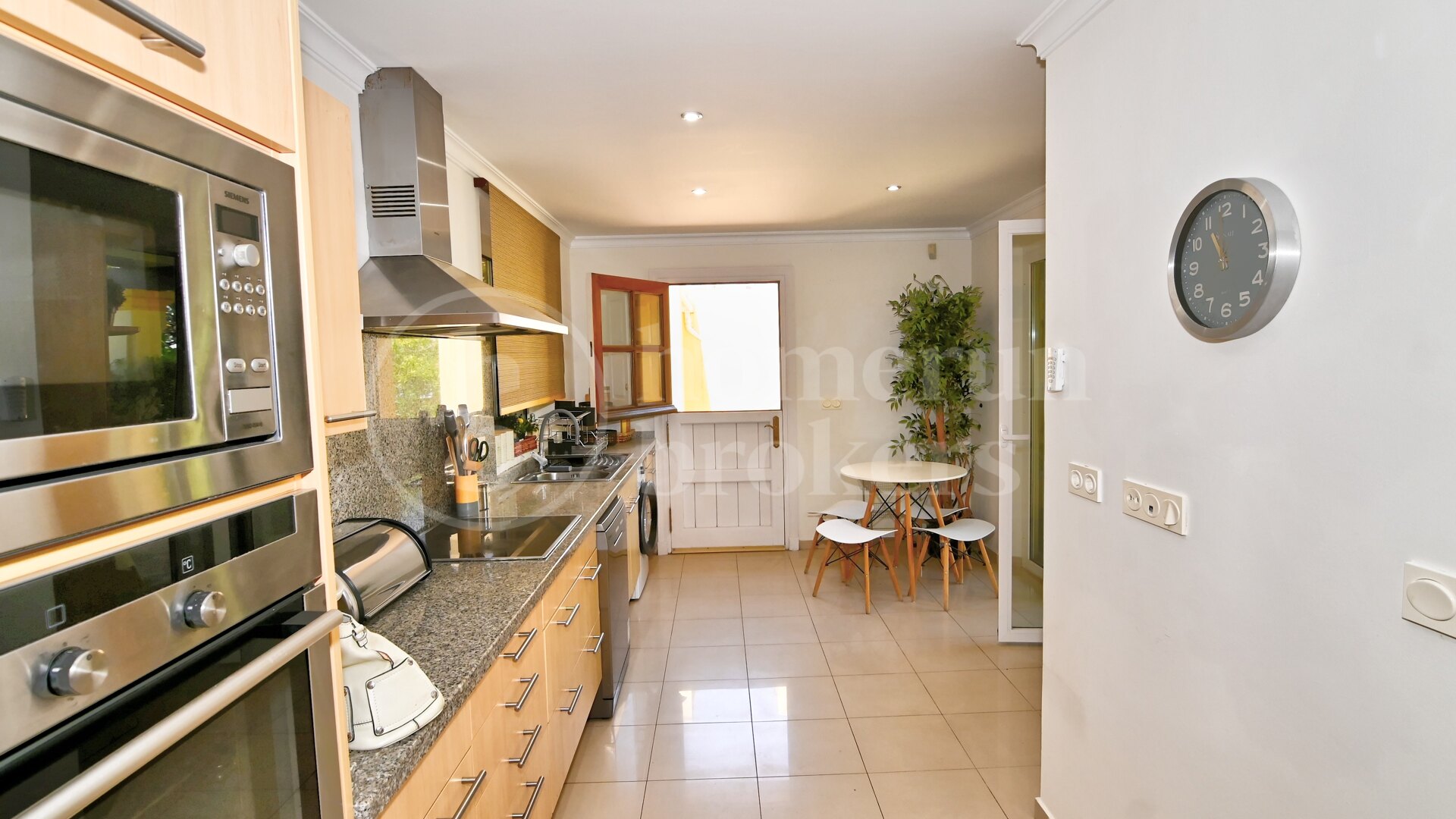 Arriving through a traditional courtyard entrance, the property immediately conveys the sense of a lived-in, well-cared-for home. The layout is designed to support everyday family life, with an open-plan living and dining area that flows directly onto the garden and pool. Large windows allow light to filter through the interior, creating continuity between indoor and outdoor spaces. The fully equipped modern kitchen complements this sociable layout, providing easy access for outdoor dining, entertaining, or simply enjoying the garden’s calm atmosphere. The villa’s mature landscaping adds privacy and character, and the private swimming pool forms the focal point of the outdoor area.