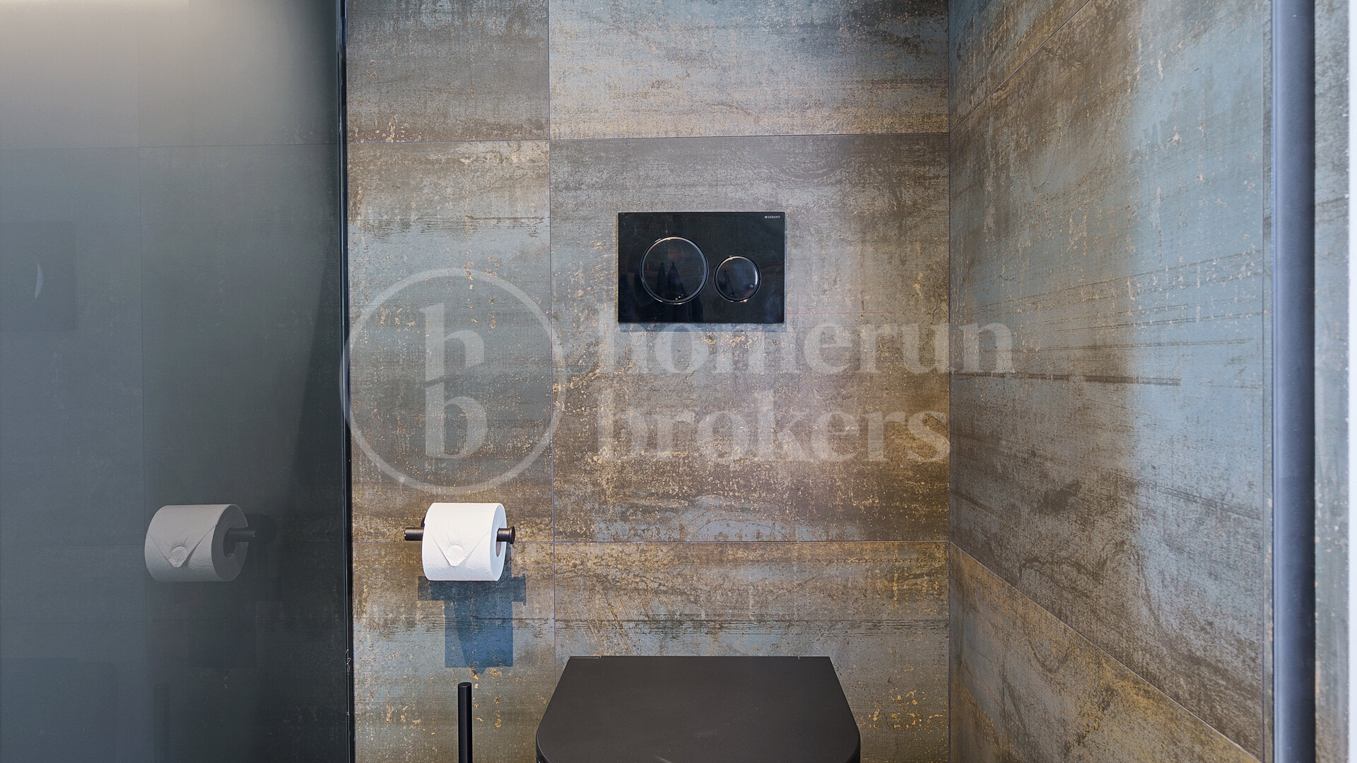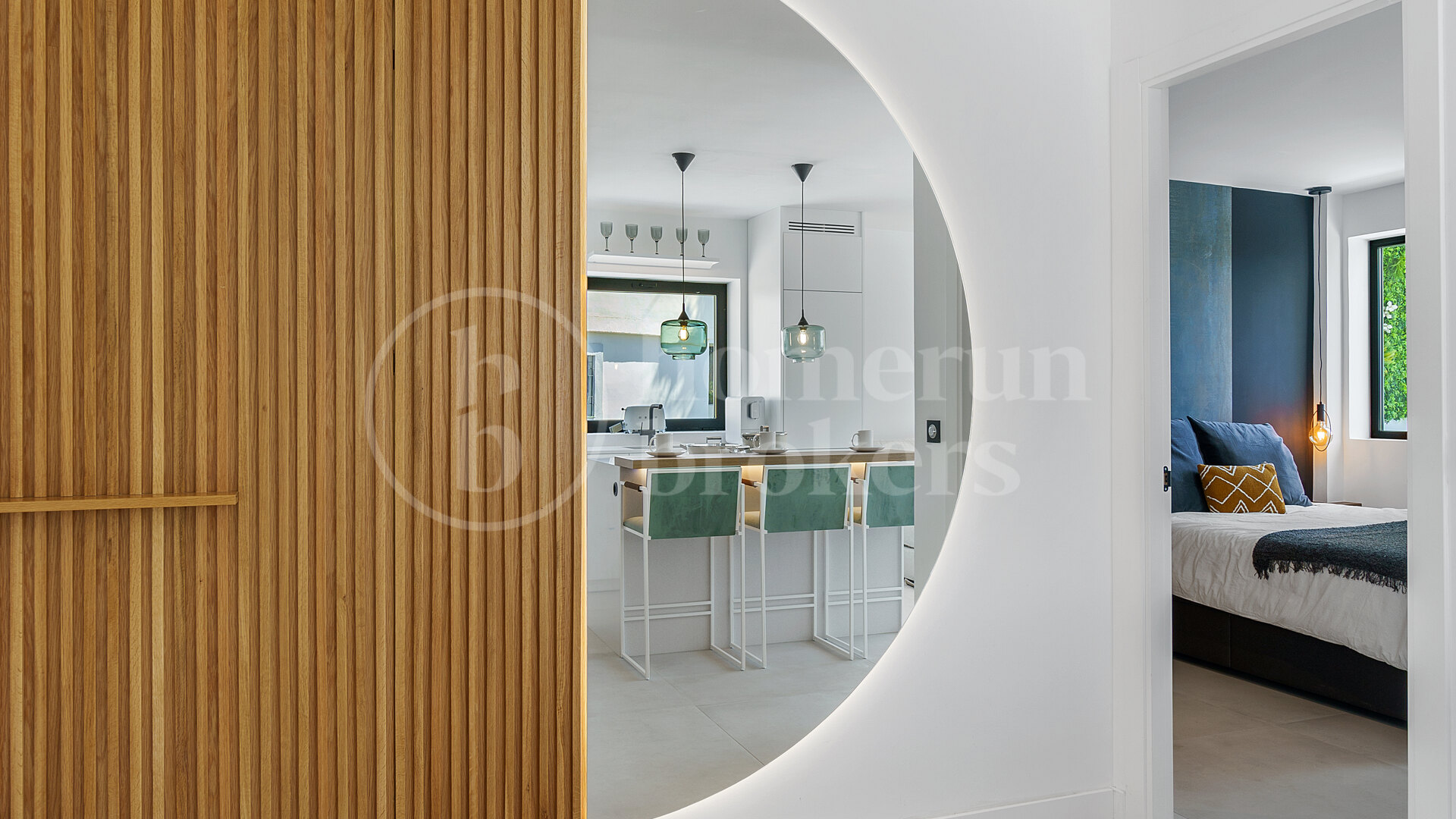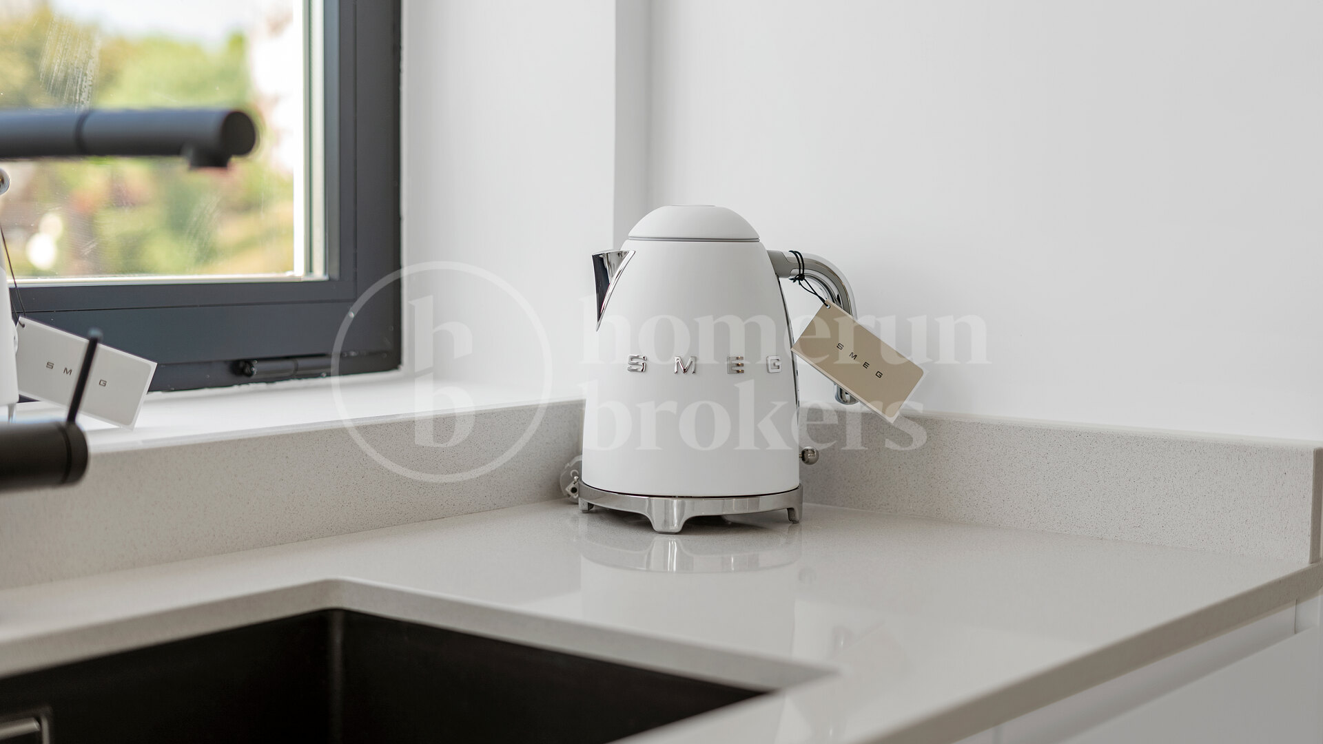 The property provides a harmonious living environment, beginning with a private entrance and staircase. The open-plan kitchen, equipped with brand-new SMEG appliances, adjoins a comfortable sitting area. The first bathroom, concealed behind an innovative wooden door, adds an element of surprise and stylish functionality to the design.
