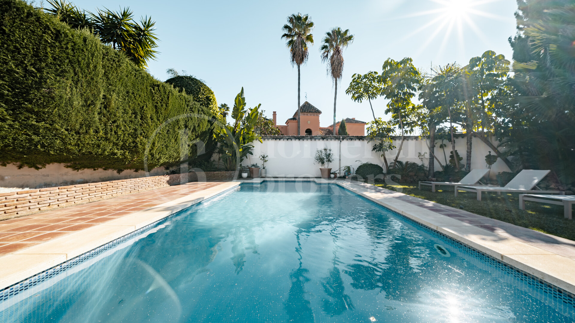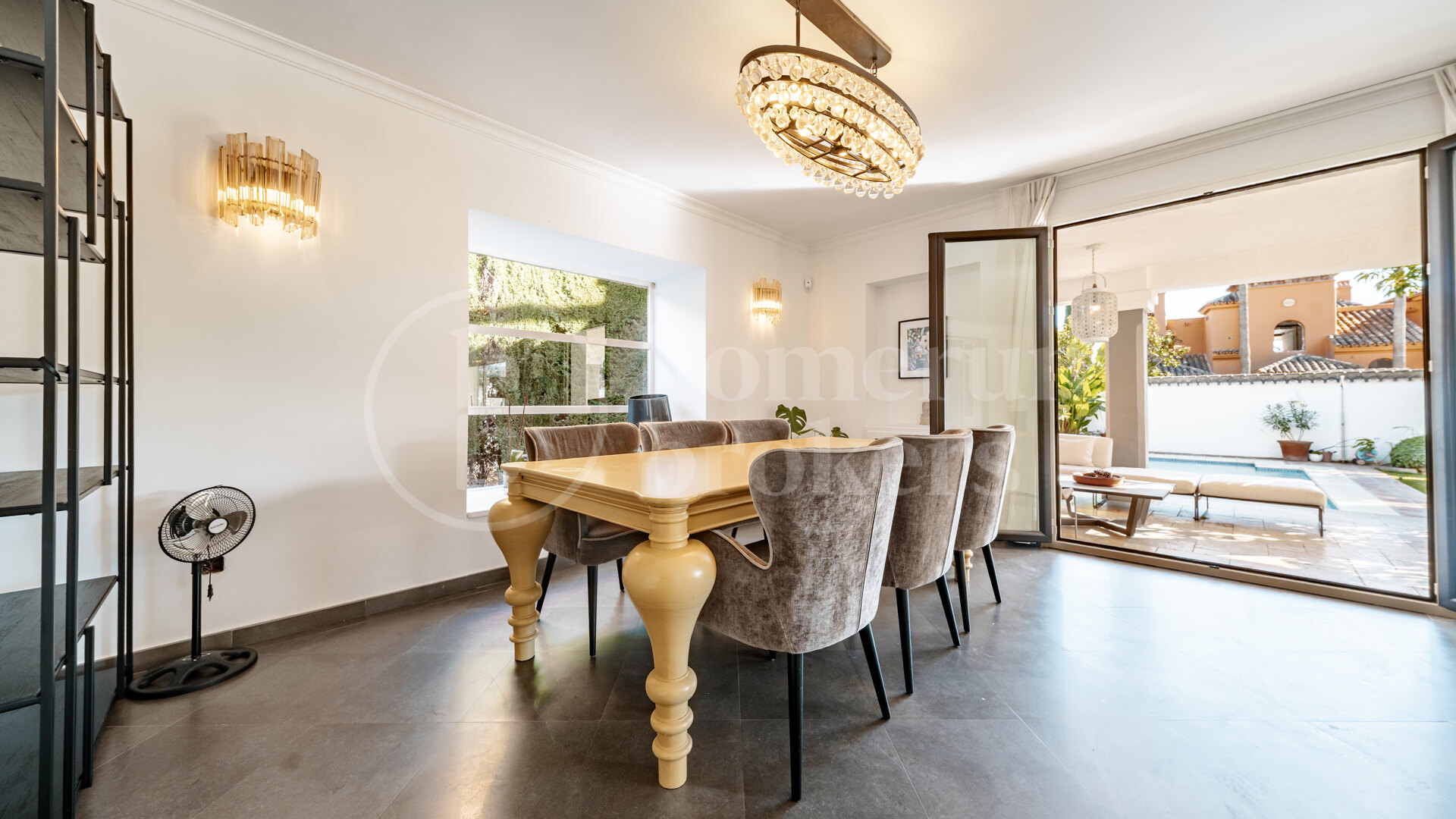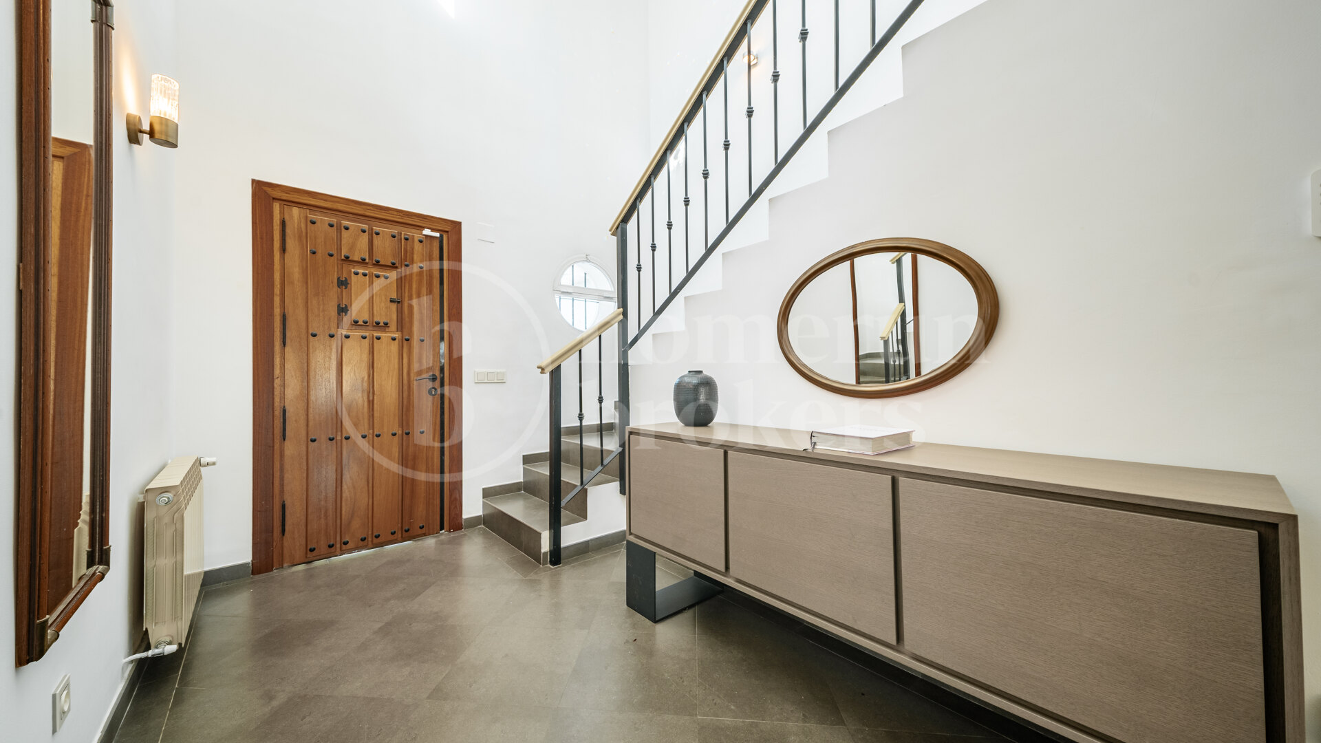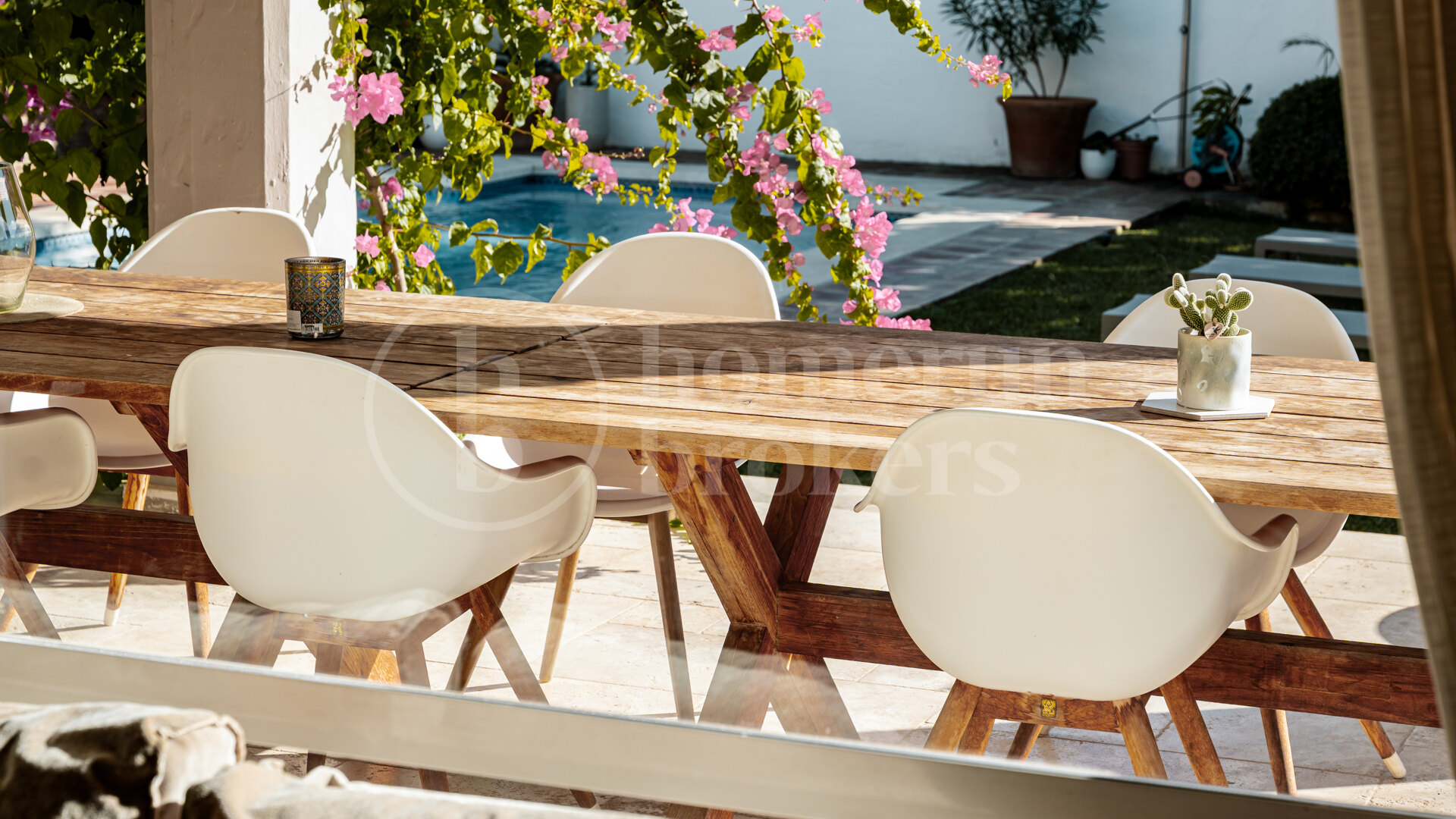 Inside, the villa boasts an open and inviting layout, combining modern comfort with timeless Andalusian details. Large windows bring in natural light throughout the day, while the generous living and dining areas create an ideal environment for both families and groups.