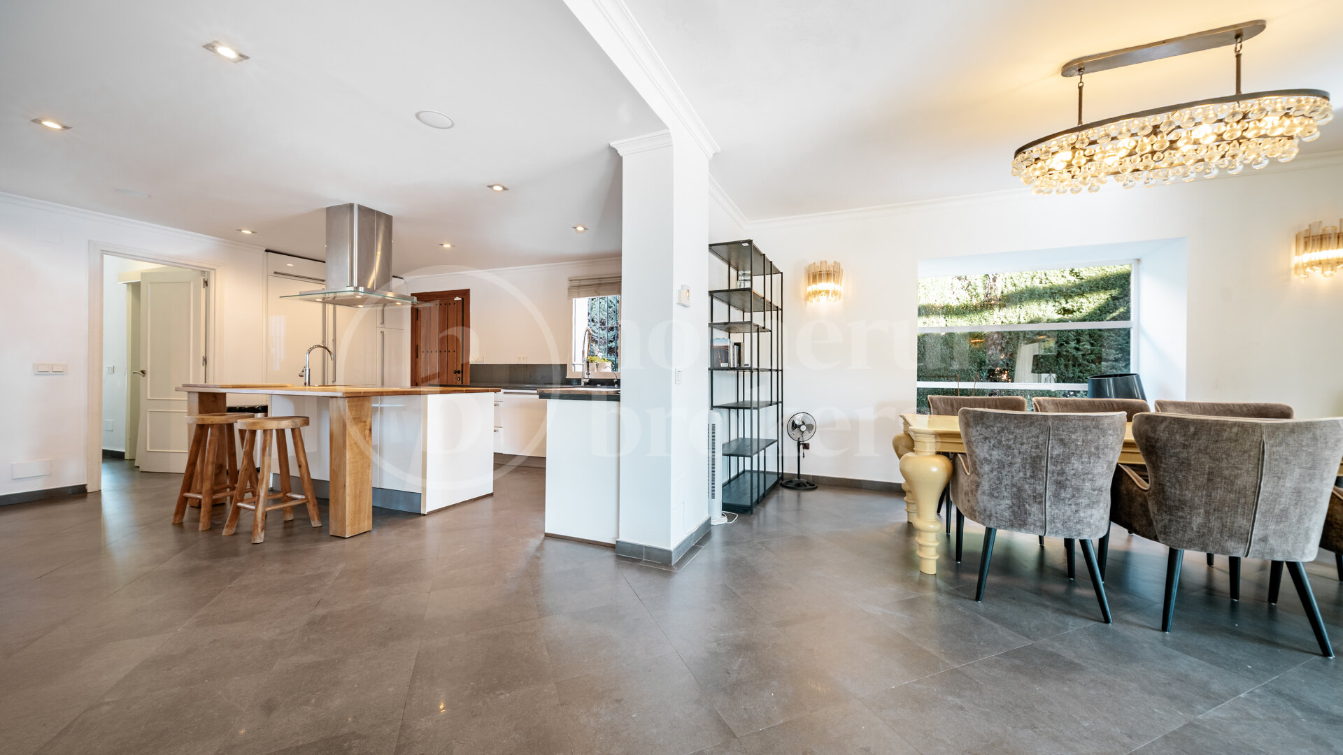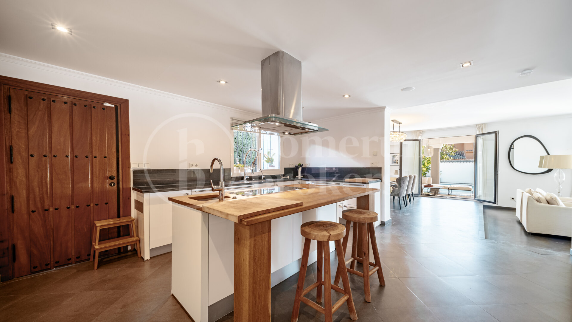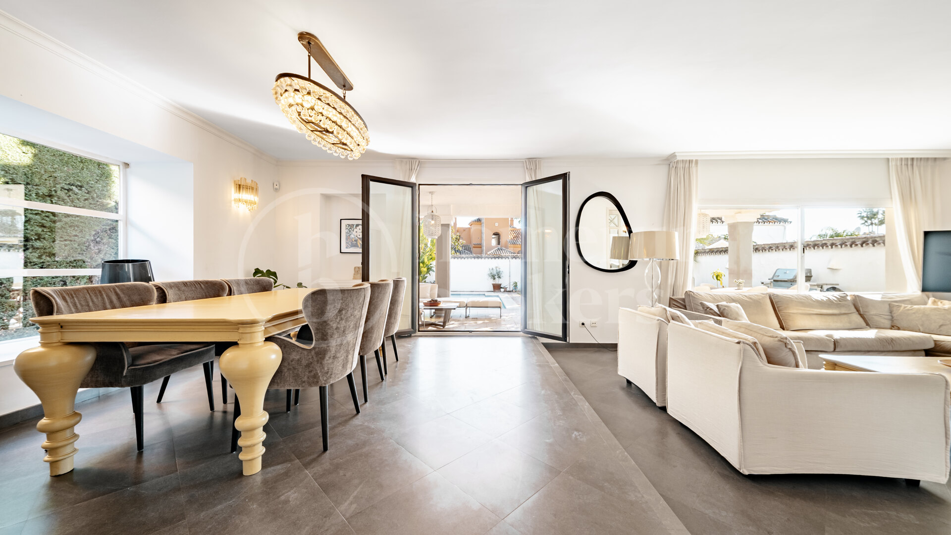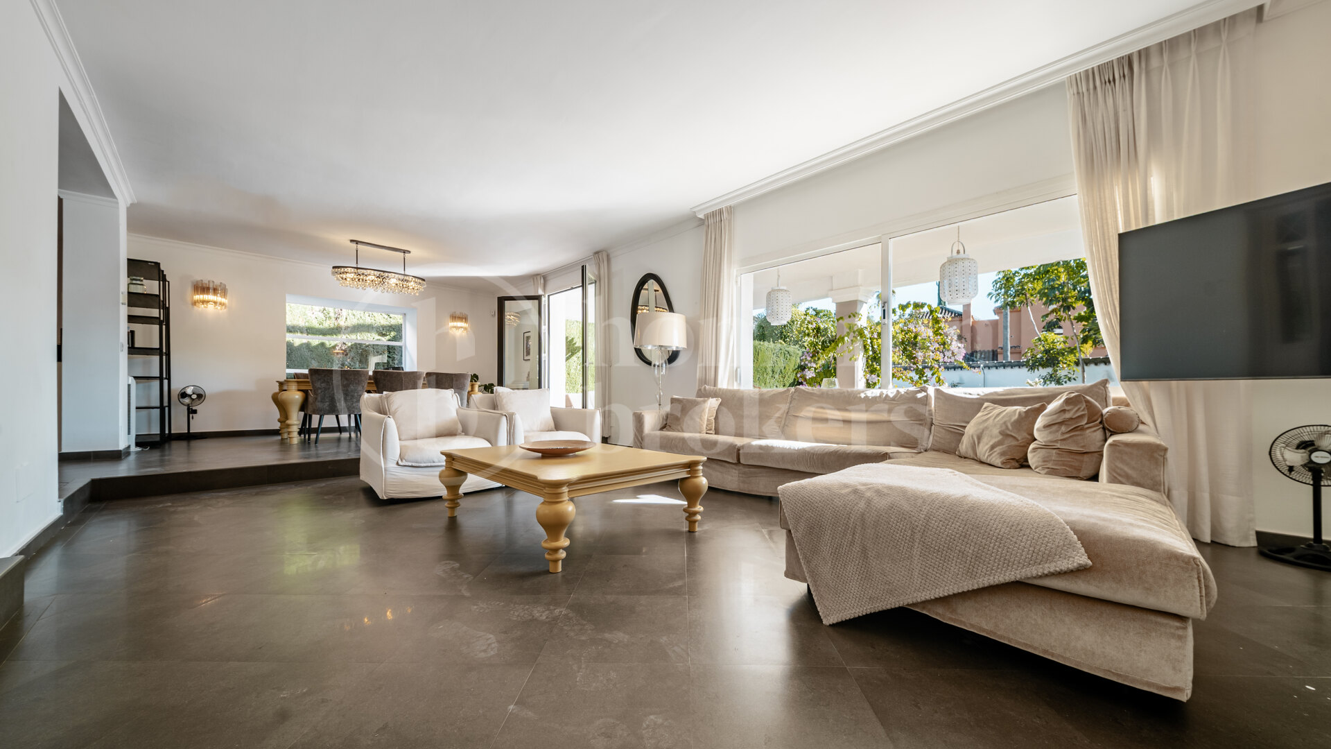 Inside, the villa boasts an open and inviting layout, combining modern comfort with timeless Andalusian details. Large windows bring in natural light throughout the day, while the generous living and dining areas create an ideal environment for both families and groups.